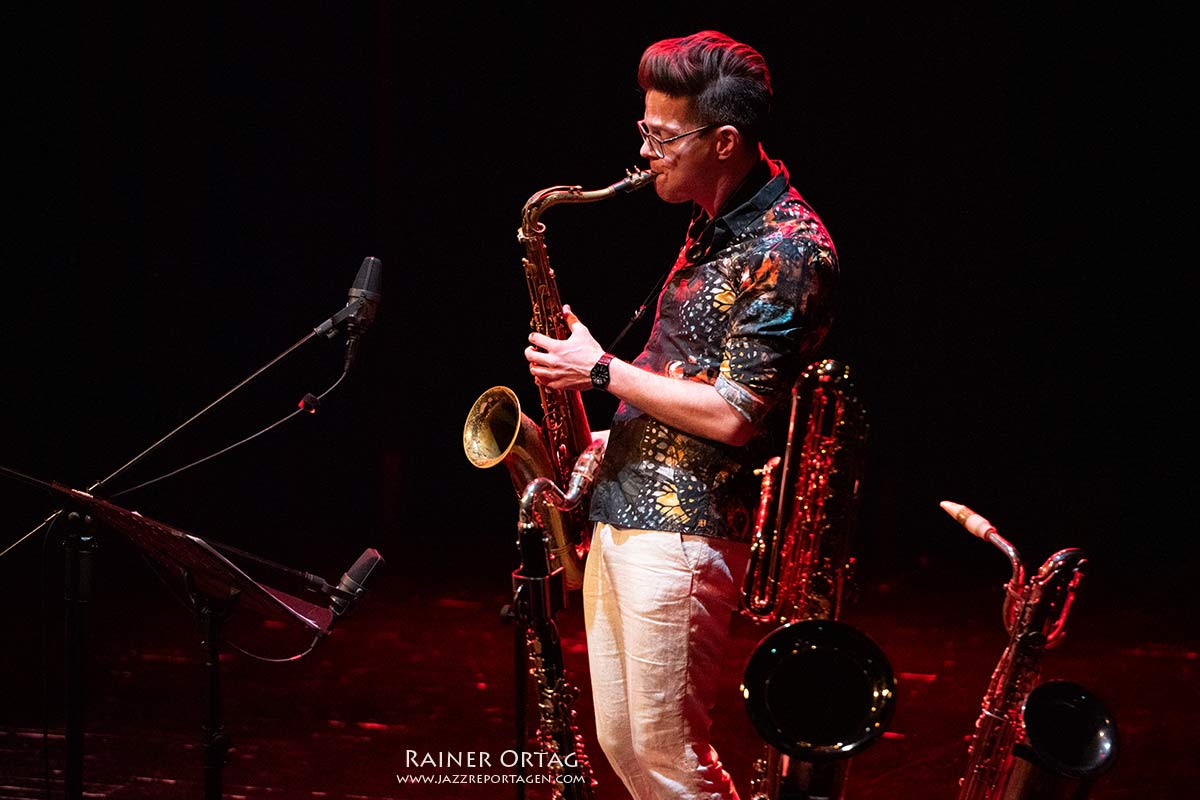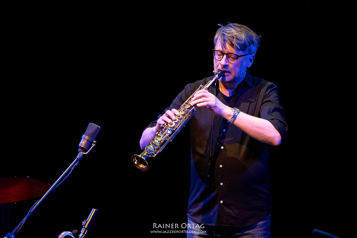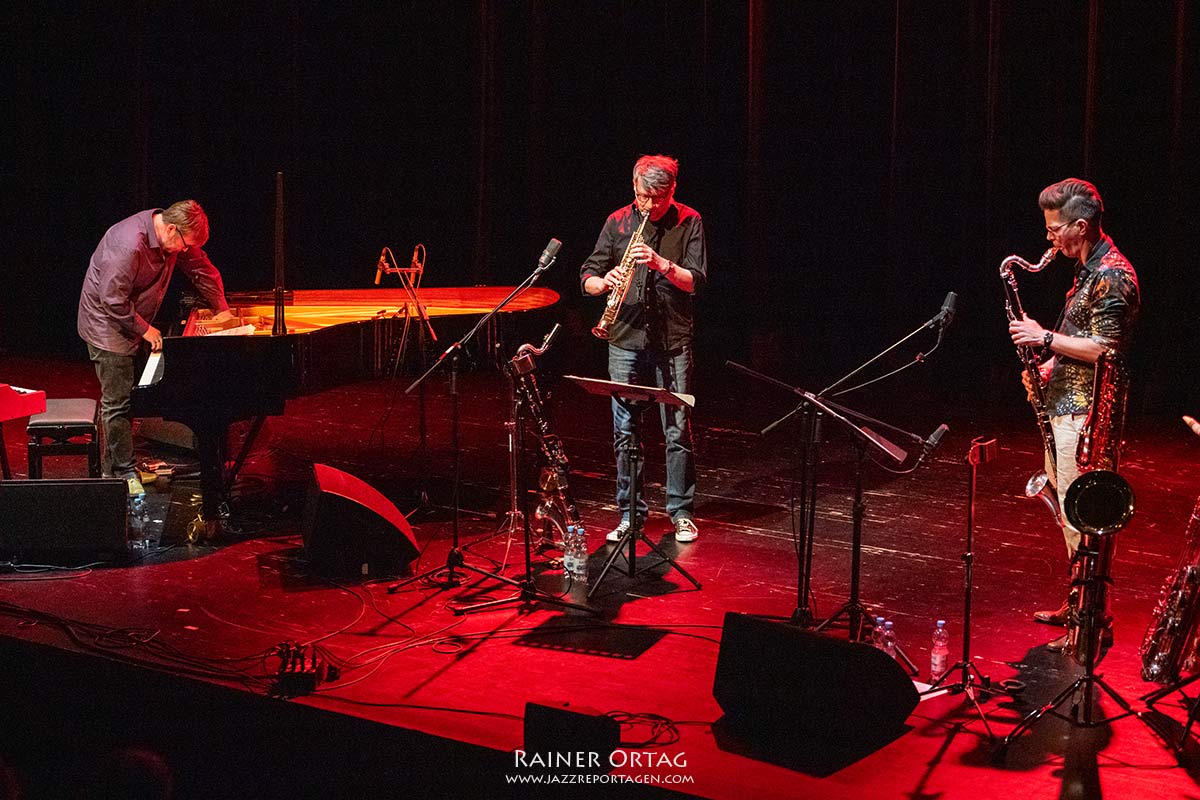 So trifft ein flächig verspieltes Klavier auf ein kanonartig wiederholendes Sopran, es entstehen Klangkollagen mit zwei Bassklarinetten oder kreischend-wehklagend seufzende Saxophone schaukeln sich zu ekstatischen Unisono-Phrasen hoch. Die beiden „älteren“ Herren geben nach entsprechender Verausgabung dann auch mal die Bühne frei für „Saxophon solo“, welches Beck mit jugendlicher Kraft eindrucksvoll zelebriert: Highnote-Stafetten, Aufschreie, „permanent breathing„, Didgeridoo-Sounds… Alles dabei was das Bläserherz erfreut! Zweifelsohne wird vom jungen Christoph Beck künftig noch viel zu hören sein. Aus dem Publikum ist anerkennendes Raunen zu vernehmen. Mit Szenenapplaus hält man sich an diesem Abend weise zurück; zu sehr hätte es das Eintauchen in die unvergleichlich komplexe und berührende Stimmung gestört. Drei große Meister ihrer Instrumente und gleichermaßen phantastische Komponisten verabschieden sich, natürlich nicht ohne lautstark geforderte Zugabe (Bebelaar: „Wir haben das jetzt so verstanden, dass wir noch was spielen“).