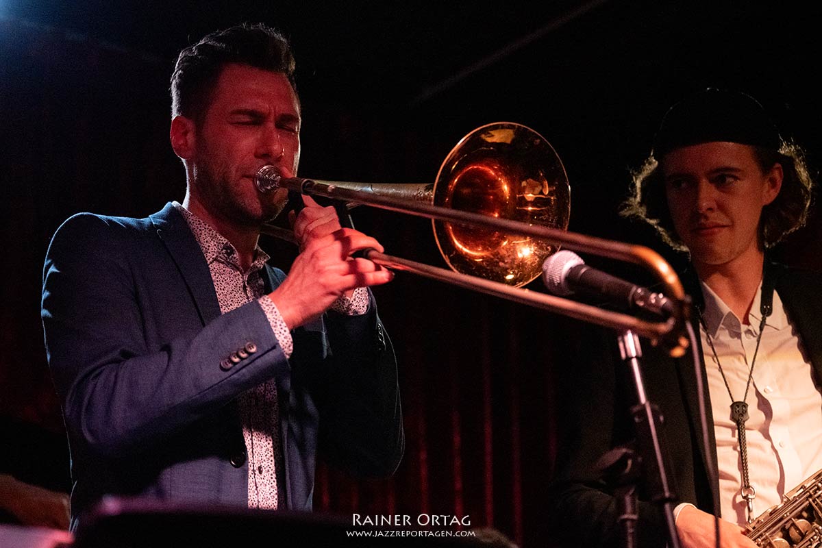 Hergekommen bin ich aber wegen „Big Soul Buisness„, gegründet vor einigen Jahren von Marc Roos, der auch nach wie vor für die Arrangements verantwortlich zeichnet. Der Posaunist ist auch mit der Band „Nolabeat„, der „Tobias Becker Bigband“ und bei „Bodenseh’s Metronome Art“ zu hören. Weiters gehören zur Band der junge Saxophonist Lukas Wögler gemeinsam mit dem Spezialisten für die tiefen Töne in vielen Formationen, Bassist Dirk Blümlein. Am Schlagzeug der Jazzdrummer-Veteran Michael Kersting, der mit allen großen Jazzmusikern der letzten vierzig Jahre zusammengearbeitet hat.
