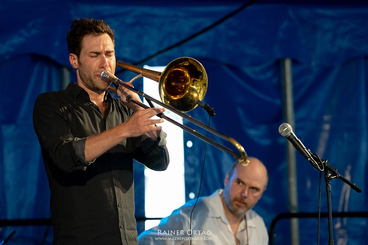In Marc Roos‘ Komposition „Lago“ fiel das Basssolo gleichsam aus der Zeit, wunderbarer Kontrast zum hohen Ticken des fünften Elements. Monks Komposition „Bemsha Swing“ wurde im Konzert zu einem modernen Strichcode – analysiert, auseinandergebaut, in Stücken fast neu zusammengesteckt. Das Farbspektrum reichte auch bei Marc Roos mit den elektronischen Loops, durch die er seinen Posaunenton durchführte, noch wesentlich orchestraler, quasi als Double seines Brasssounds.