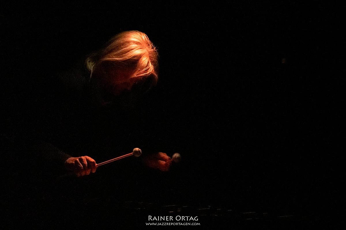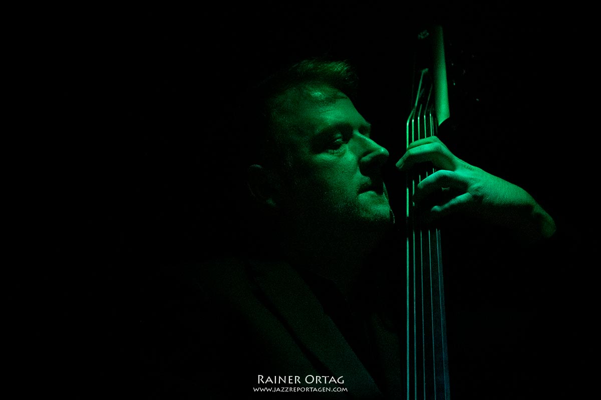 So wie sich die Augen langsam mit der Dunkelheit arrangieren und immer mehr erkennen, so nimmt nach und nach auch die Musik Gestalt an. Ein e – Steh – Bass links, ein bisschen Keyboard und Schlagwerk dazu, hier nimmt Robin Rodenberg Platz. in der Mitte sitzt Morten Gass an allerlei Tasteninstrumenten, nimmt immer mal wieder eine Gitarre zur Hand, hat ein, hat zwei Becken in seiner Nähe, die unaufdringlich und fein für ein langsam pulsierendes Grundmetrum sorgen. Und rechts steht im zarten, wechselweise violetten oder türkisen Lichtkegel Christoph Clöser und spielt Saxofon oder Vibrafon. Die Musik bewegt sich langsam aber zielgerichtet durch die Nacht. Es sind Saxofonlinien voller Sehnsucht, es sind Pianophrasen, aufgelöste Akkorde, die immer wieder zurückfinden zu einem grundlegendem Gesamtklang, der sich – trotz Dunkelheit & Tieftonlastigkeit – schwerelos leicht durch die Nacht bewegt.