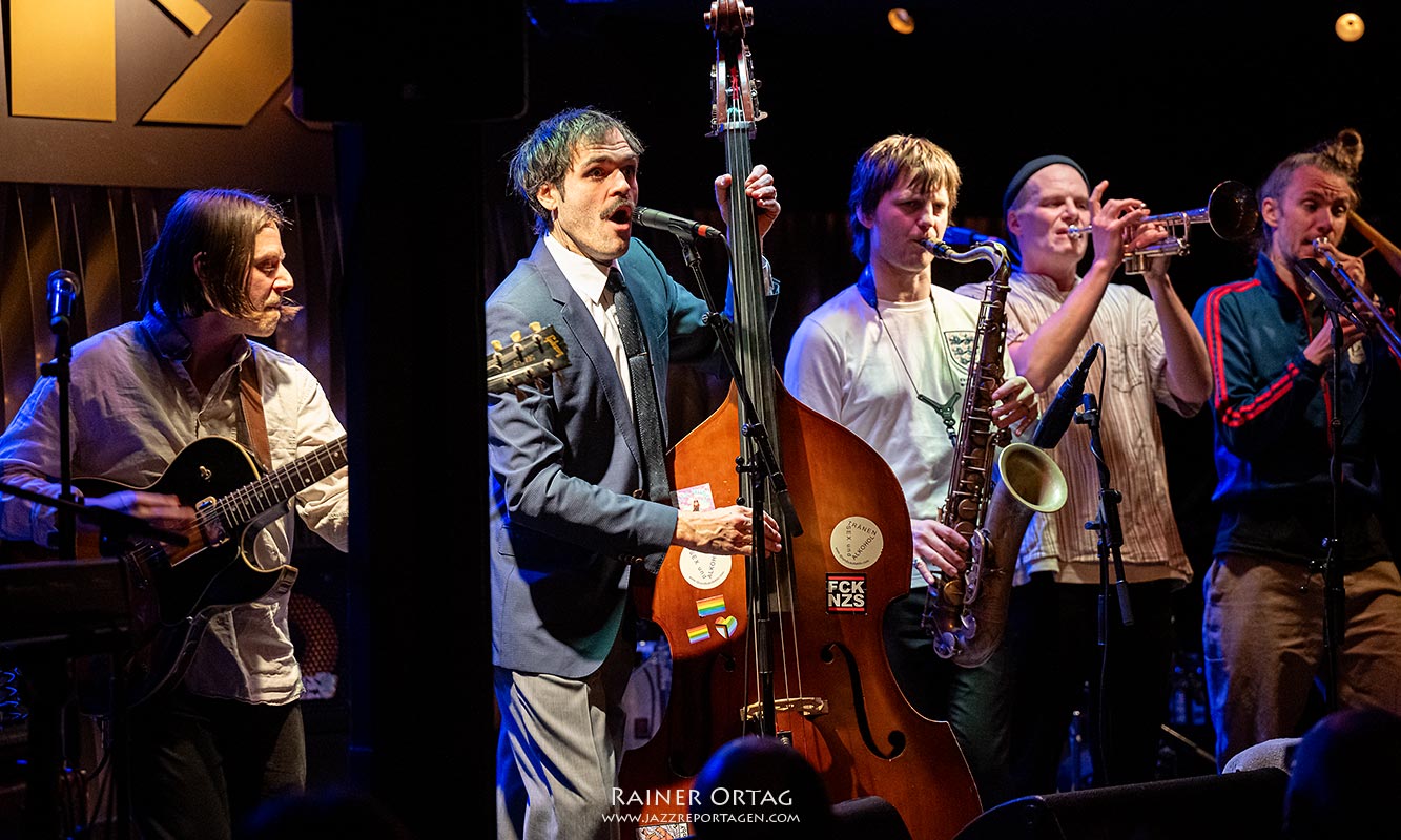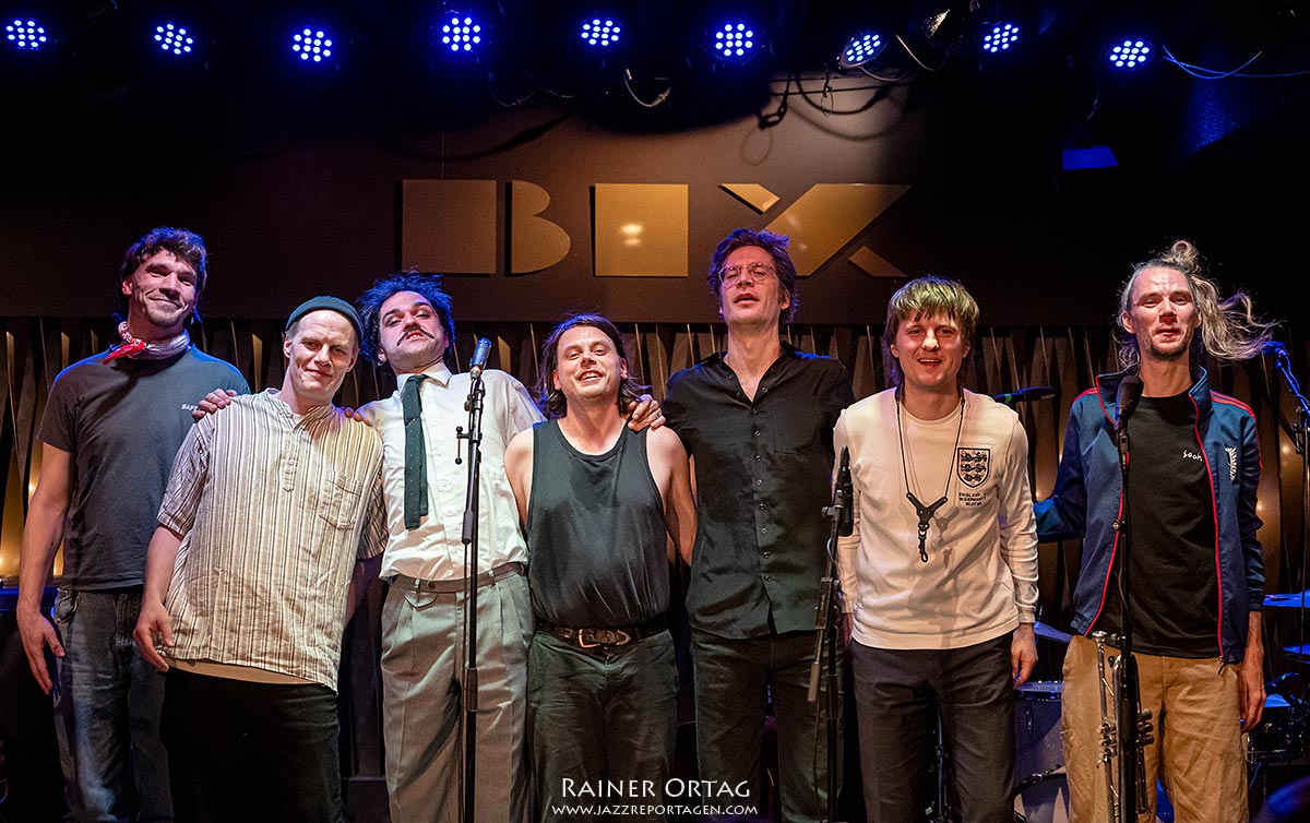 …wäre ihm sicher der Pinsel aus der Hand gefallen! Zunächst betraten nur der Sänger und der Mann an den Keys die Bühne. Es begann fast noch gesittet. Doch nach und nach gesellte sich der gesamte Haufen dazu. Sieben Musiker, die sich keinerlei Schranken auferlegen. Einen festen Komponisten für ihre Stücke gibt es nicht – es sind immer alle sieben. Eine Woche in Klausur, und was dann dabei herauskommt, lässt sich bei der nächsten Tour erleben. Wir hatten das Vergnügen, einen einzigartigen Botticelli-Mix aus Jazz, Punk, Balkan-Sound, Gypsy Jazz und vielen weiteren Stilrichtungen zu erleben.