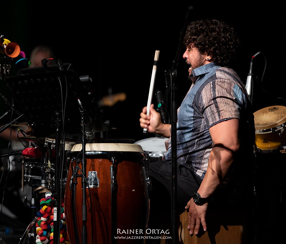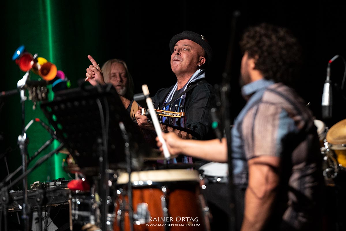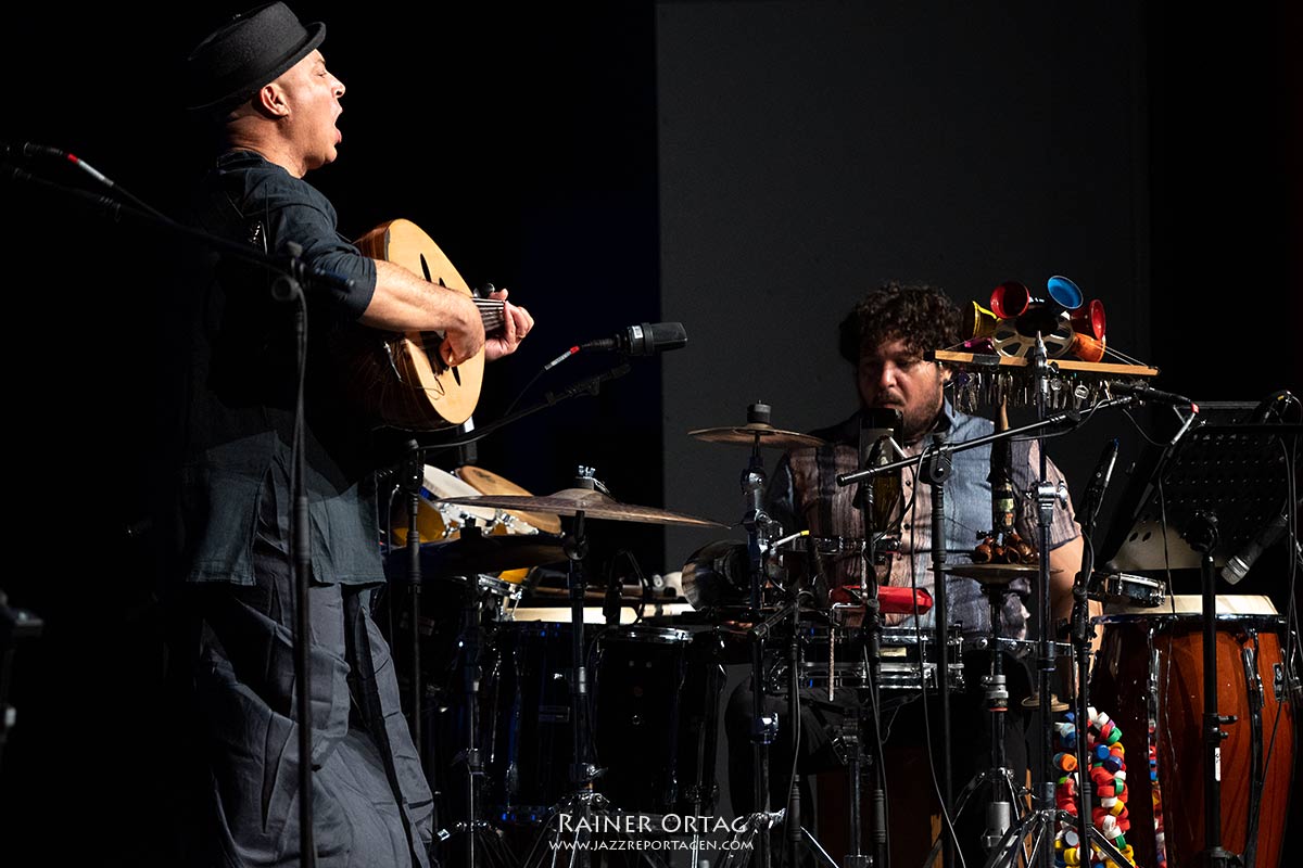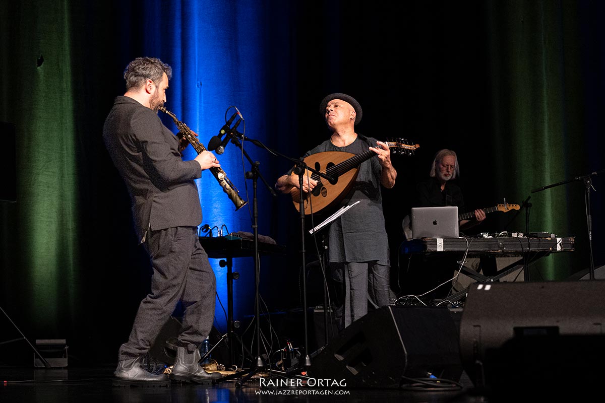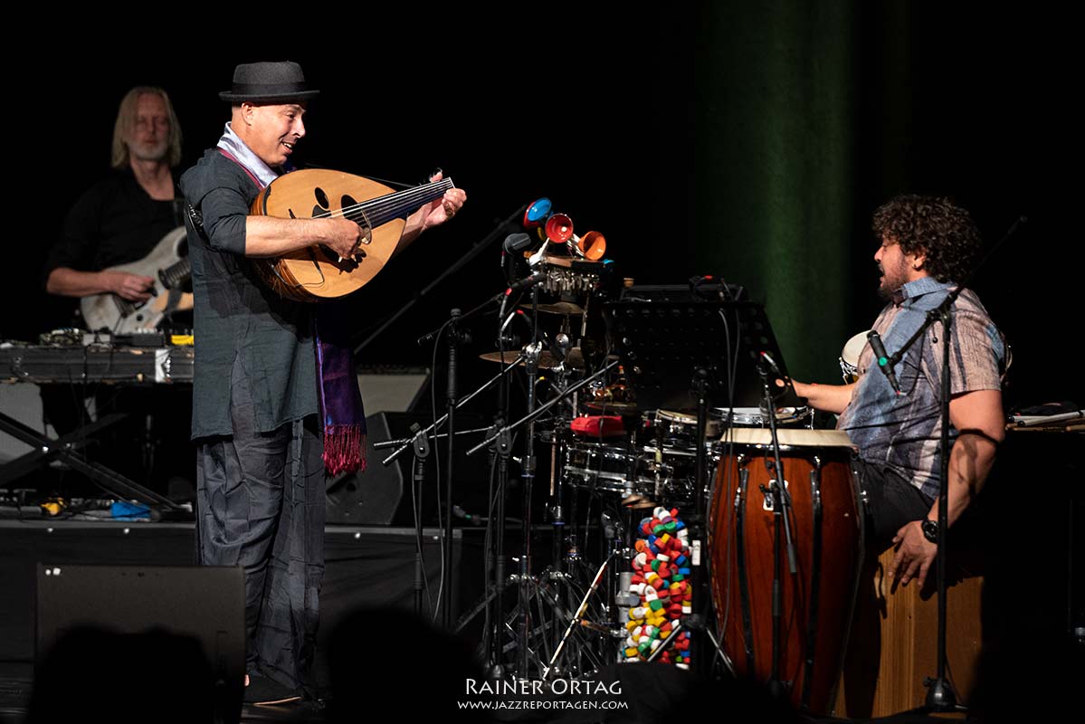 Diese Vielschichtigkeit, dieser musikalischen Kontakte zeigt sich auch an diesem Abend im Neckarforum. Schon nach wenigen Minuten ist das Publikum gebannt von Youssefs feinem, poetischen Oudspiel und von dem faszinierenden Klang seiner klaren und teilweise in magische Höhen aufstrebenden Stimme. Eigentlich war das Konzert für ein Trio angesagt, neben Youssef waren Raffaele Casarano am Saxophon/Klarinette und Adriano dos Santos an der Percussion im Programm angekündigt. Die Band wurde an diesem Abend durch den norwegischen Gitarristen Eivind Aarset, den Youssef als musikalischen Blutsbruder und jahrzehntelangen Wegbegleiter bezeichnet, ergänzt, was sich im Laufe des Abends als absoluter Glücksfall herausstellen sollte. Im Mittelpunkt stand diesmal sein 2018 erschienenes Album „Sound of Mirrors“, in dem sich der Tunesier vorwiegend der indischen Musik widmet. Rhythmus spielt in den knapp 100 Konzertminuten eine große Rolle, und schon in der ersten Hälfte des Konzertes fragt sich der Zuschauer wie der wohlbeleibte Schlagwerker dos Santos, dieses teilweise durch die rockig gespielte Oud angetriebene Rhythmusinferno durchhalten will. Die linke Hand ständig an der wummernden Cajon, rechte Hand und beide Beine bearbeiten den Rest des großen Percussionsarsenals. Doch immer wieder gleitet der Sound in märchenhafte, orientalische Gefilde ab, was dem Mann am Schlagzeug regelmäßige Pausen verschafft.