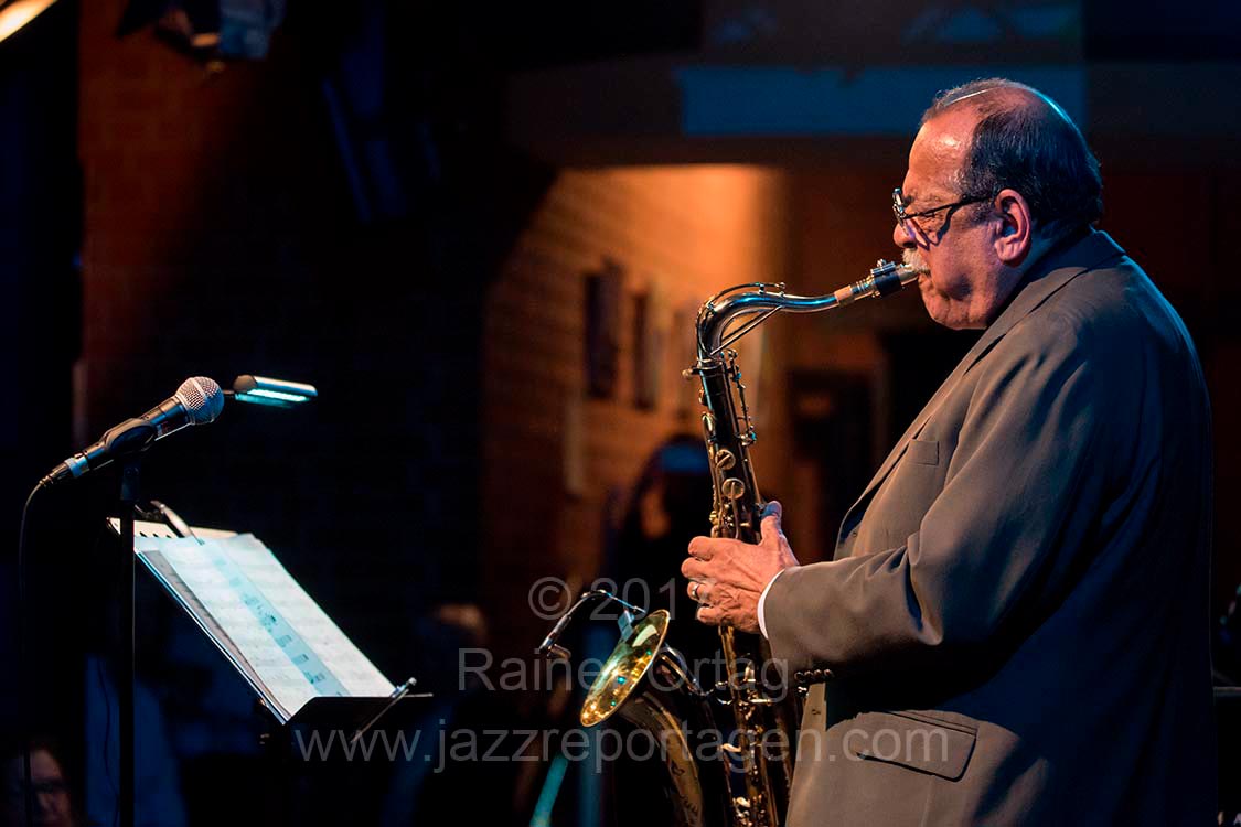 Hier im Münchner Jazzclub war er mit seiner europäischen Band, bestehend aus Christof Saenger am Piano, Rudi Engel am Bass und dem Schlagzeuger Tobias Schirmer. Die meisten Titel, die wir zu hören bekamen, waren auch aus der Feder des Bandleaders, alle anderen Bandmitglieder haben aber ebenfalls Kompositionen beigetragen. Eines seiner Stücke hieß „I forgot August“ als Gegenstück zu „I’ll Remember April“, wie er dem Publikum erklärte. Das Konzert dauerte 3 Stunden, mit einer kurzen Pause, wobei der inzwischen 72-jährige bei der Zugabe genauso energetisch und druckvoll spielte wie zu Beginn der außergewöhnlichen Darbietung. „Bebop“ von Dizzy Gillespie spielte er in so einer Geschwindigkeit und mit so ausgeprägter Improvisationslust, daß den Zuhörern fast schwindlig wurde.