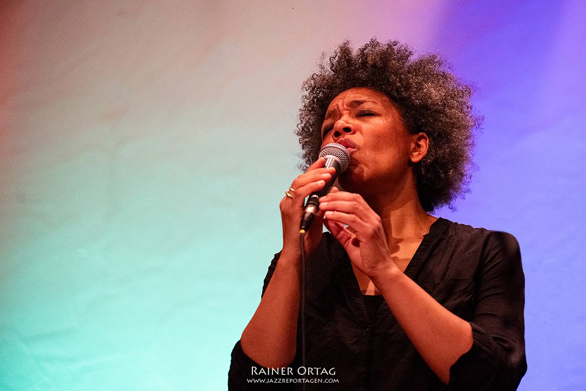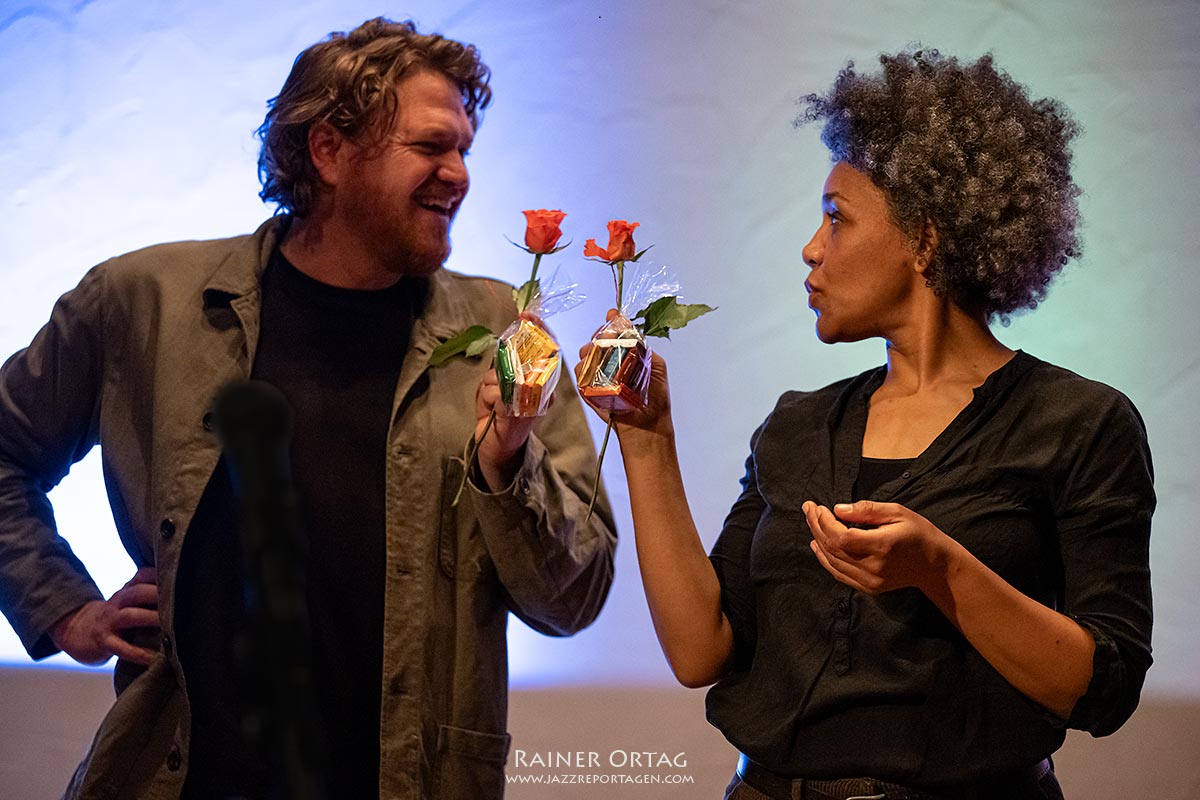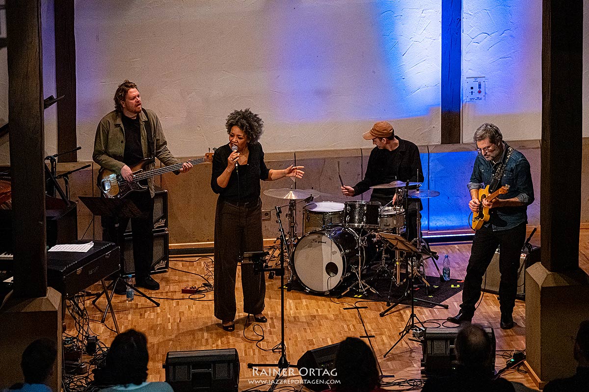 Und Fola Dada? Voll des Lobes über Ambros, wie auch über die drei anderen Freunde Martin Grünenwald (Drums), Ulf Kleiner (Piano) und Joscha Glass (Bass). wartete sie mit allen Facetten ihres vokalen Könnens auf. Mit einer wunderbaren Dynamik und einem beachtlichen Stimmumfang „lebt“ sie den Blues wie kaum eine andere. Zudem schien sie an diesem Abend bei einer Nummer demonstrieren zu wollen, wie lange man den Ton in einer hohen Lage halten kann. Alleine vom Zuhören und Zuschauen japsten wohl einige Besucher nach Luft und bedachten diese Leistung mit frenetischem Szenenapplaus. Bei Jazz, wie auch beim Blues nehmen Improvisationen einen hohen Stellenwert ein; in Schönaich durfte man das auch hinsichtlich der verbalen Kommunikation unter den Bandmitgliedern erleben. Die zeigten neben überschäumender Spielfreude auch szenische Improvisation mit viel Spaß und Humor.