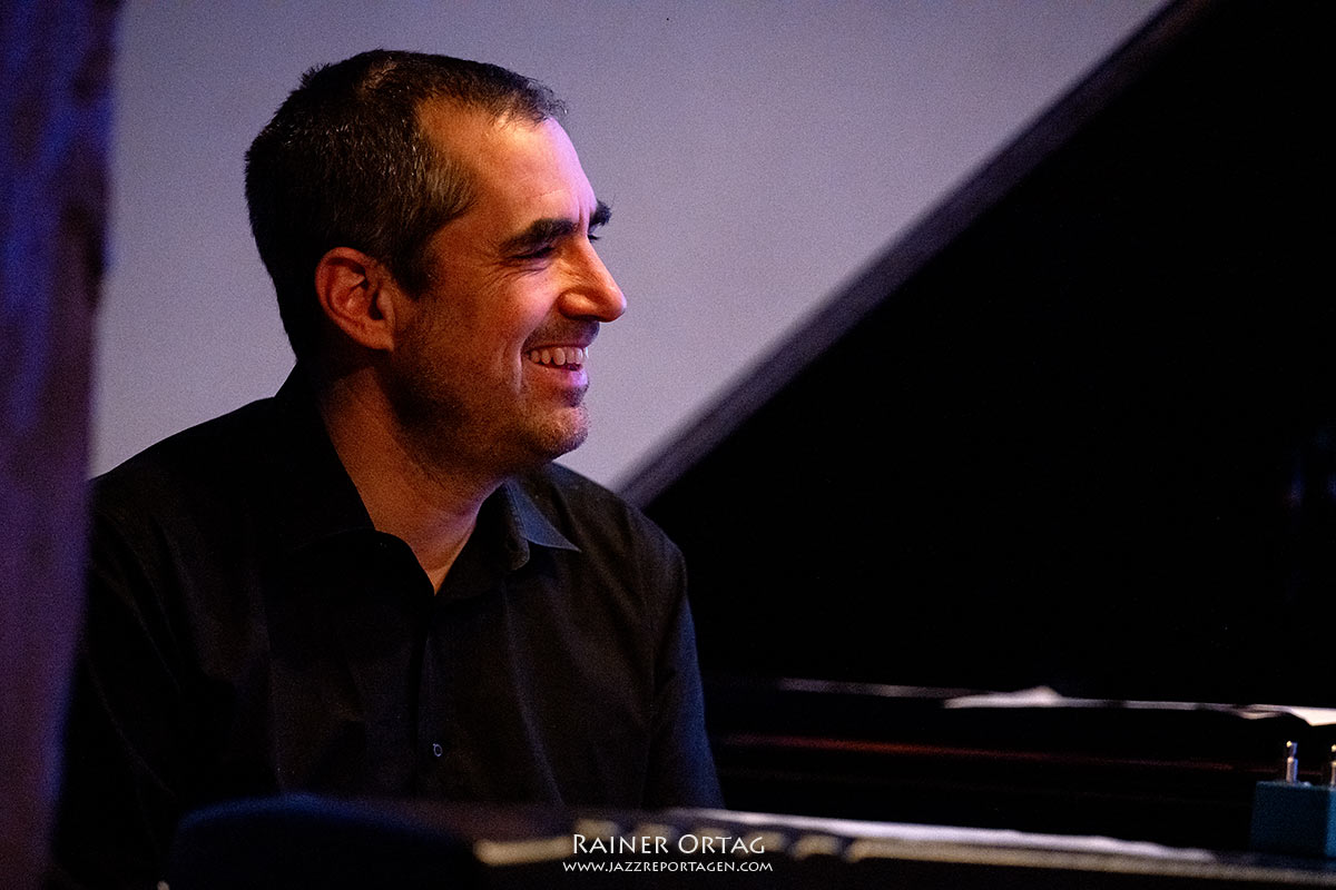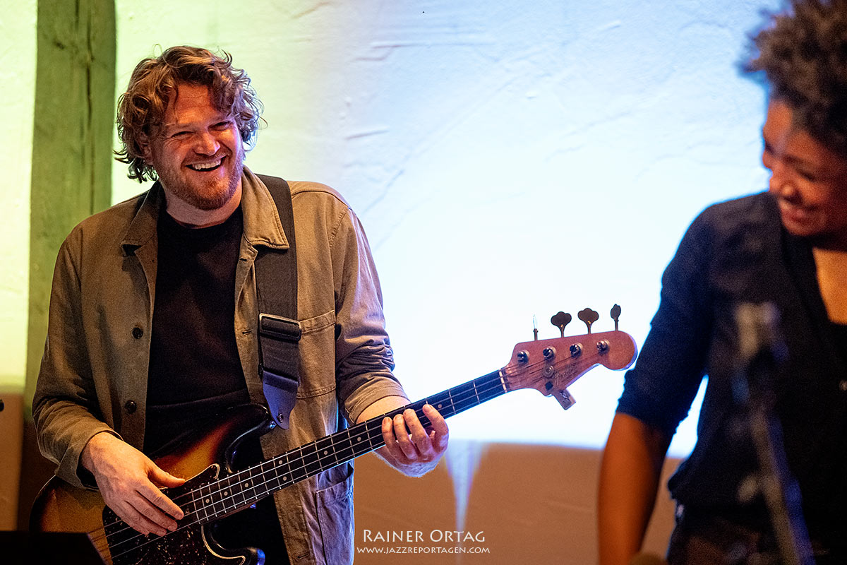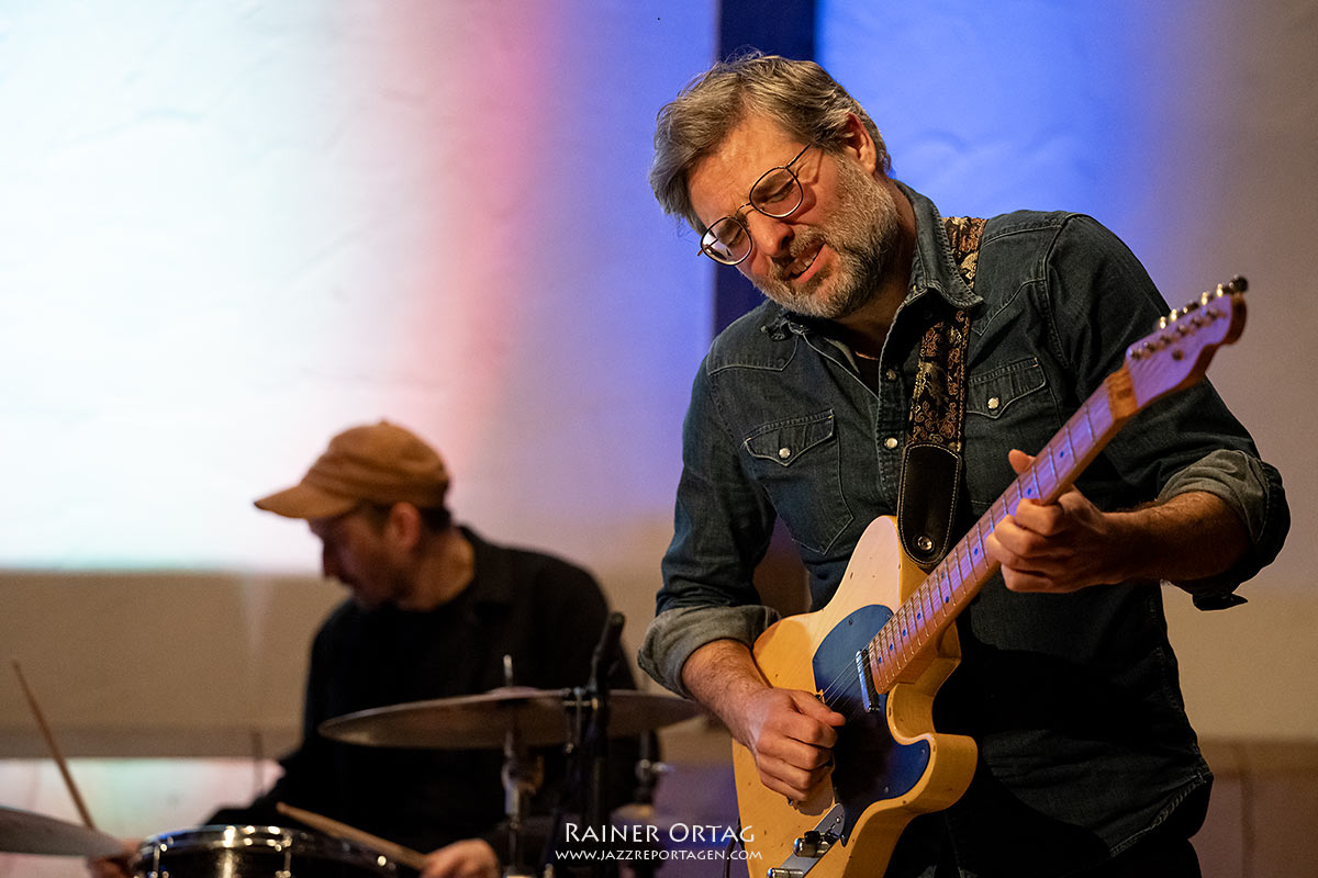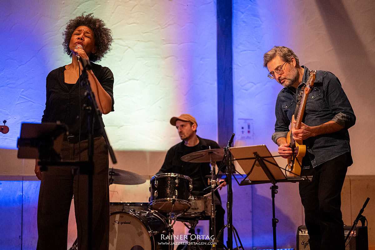 Mit an ihrer Seite an diesem Abend Gitarrist Jo Ambros. Um es vorweg zu nehmen: Die können auch Blues; und wie! Schließlich ist dieses Genre neben Worksongs, Spirituals und Ragtime einer der Wurzelstränge des Jazz. Nach dem sonnigen Samstagnachmittag wurde es auf der Bühne zunächst stürmisch, wenn auch nur musikalisch. „Stormy Monday Blues“ begann mit einem Gänsehaut-Intro und bereits bei „Stop This World“ war Ambros nicht mehr zu stoppen und dessen spannende Gitarrenlicks gingen tief unter die Haut. Die Hingabe, mit der der Berliner und Ex-Böblinger seine 6 Saiten zum Schwingen brachte, war durchaus überraschend. Mimik und Gestik verrieten, dass er im Herzen wohl ein Blueser sein muss. Im Gegensatz zu diffizilen jazzigen Arrangements bietet der Blues natürlich noch mehr Freiräume um, im positiven Sinne, mal „die Sau raus zu lassen“. Ein ums andere Mal zeigte Ambros, dass er sich hinter keinem Bluesgitarristen mit Weltruf zu verstecken braucht.