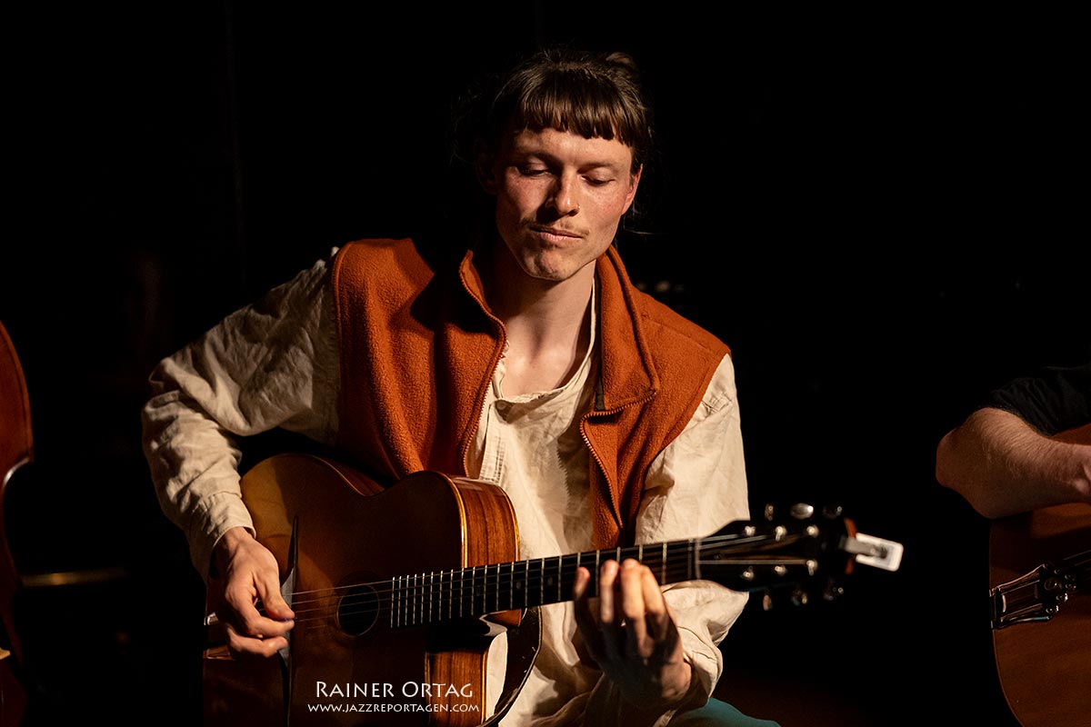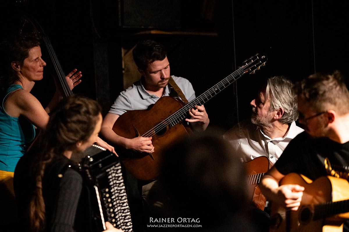 Vor der Pause hatten wir das Vergnügen das Diknu Schneeberger Trio zu hören, danach durften die Workshop-Teilnehmer beim gemeinsamen Musizieren ihr Erlerntes vorführen. In wechselnder Besetzung zeigte sich schnell, dass hier keine Anfänger an ihren Instrumenten zu hören waren. Neben Gitarren waren auch zwei Kontrabässe und ein Akkordeon zu genießen.