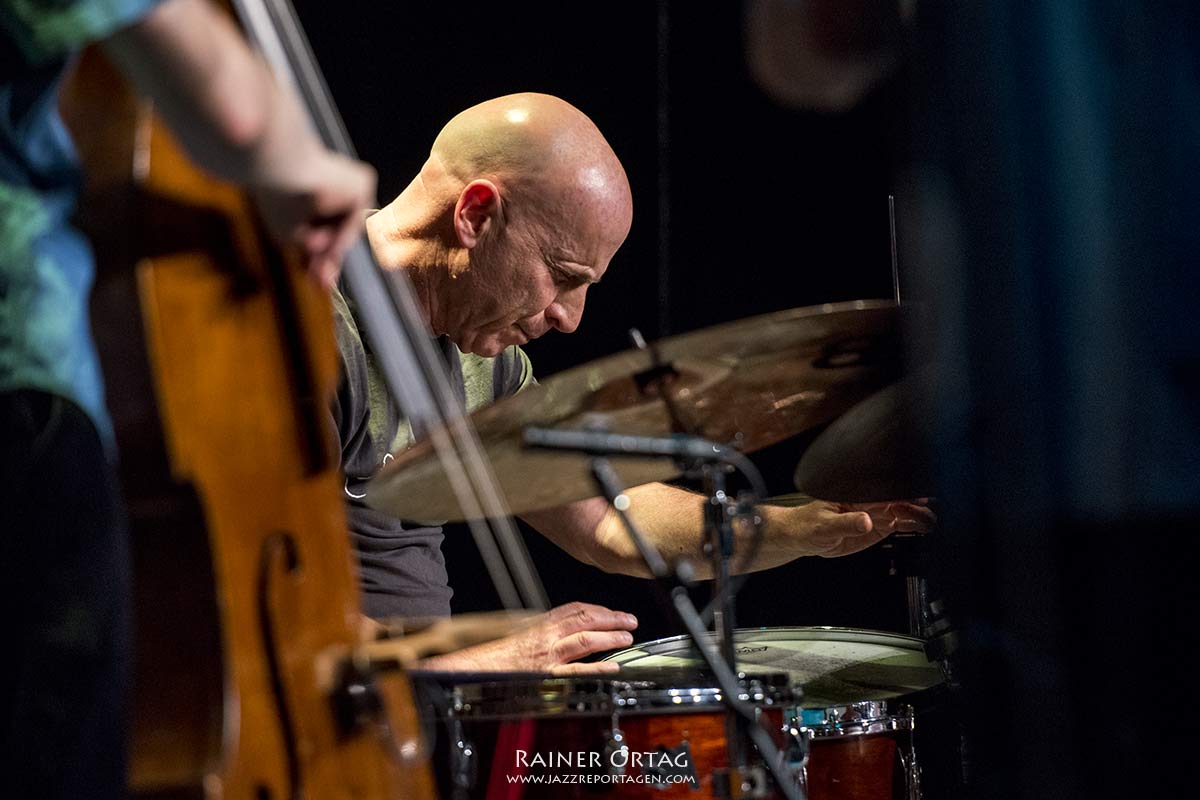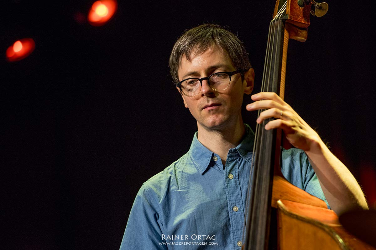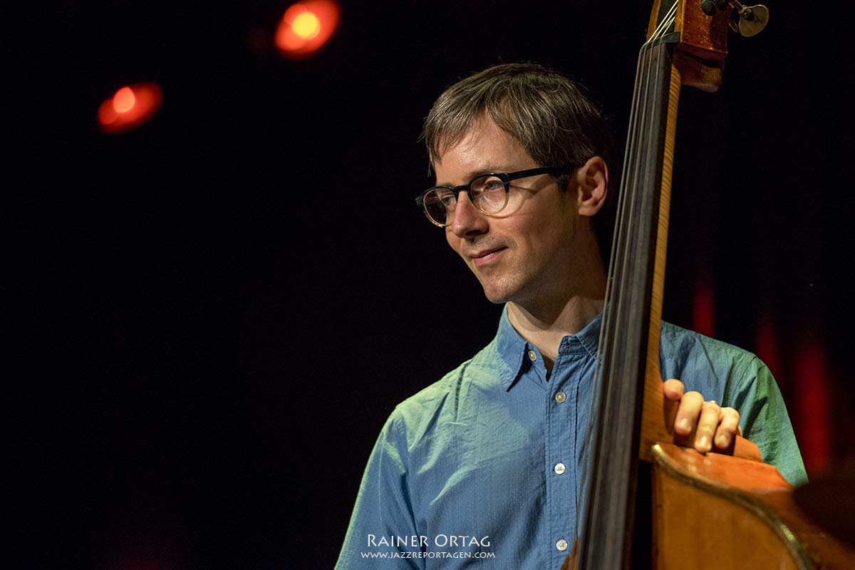 Thomas Morgan steht stoisch neben dem großen Kontrabass, langsam entfalten sich auch seine Töne, er lauscht ihnen nach, als wären sie sein lautmalerischer Gedankenstrom. Fast traumverloren gibt der junge Bassist seinem Spiel Ausdruck und Tiefe.