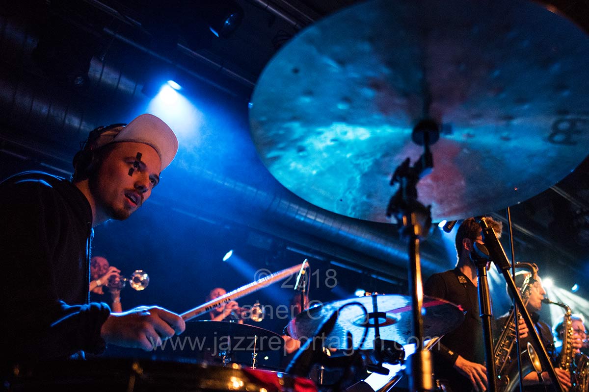 Die Posaune schlängelt sich mal improvisierend, dann wieder aufbrausend durch den Saal. Mehr als zehn Bläser und gleich zwei Drummer fallen ein und drängen sich nach und nach in den Vordergrund. Ein E-Bass und eine Basstuba geben tiefe, pulsierende Töne von sich und das E-Piano wirft scheppernde Töne ins Geschehen, das sich immer mehr verdichtet und Instrument um Instrument, Farbschicht um Farbschicht zulegt. Vor uns musiziert eine Bigband, nur klingt sie nicht immer danach. Oft kommt sie als kraftvoller Drum-’n‘-Bass-Koloss daher, zuweilen wird sie von technoiden Rhythmen aufgebrochen, in ihre Einzelteile zerlegt und überführt das Konzert in eine aufgedrehte Technoparty. Der Münchner Posaunist Roman Sladek hat da 15 Musikerinnen und Musiker um sich geschart, die meist in halsbrecherischem Tempo und mit technoidem Einschlag ein Feuerwerk geballter Bläserpower abzieht.