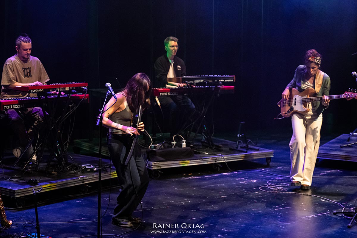 Kinga Glyks Band, ein Quintett mit gleich zwei Keyboardern, featured auch die Saxofonistin Hailey Niswanger, deren Name zu merken sich lohnt. Optisch wird die Bühnenpräsenz von einer Keyboard-Batterie dominiert, der elektronisch geprägte Sound überrascht dann auch nicht. Nach lyrischem Einstieg heizt die polnische Funkbass-Diplomatin Band und Publikum mit einem fetten Bassvamp auf. Die Komposition, eindringlich und mitreißend, hat ordentlich Muskeln und bietet Hailey Niswanger am Aerophone das erste Mal Gelegenheit, ihre Skills vorzuweisen. Das kann ja heiter werden!