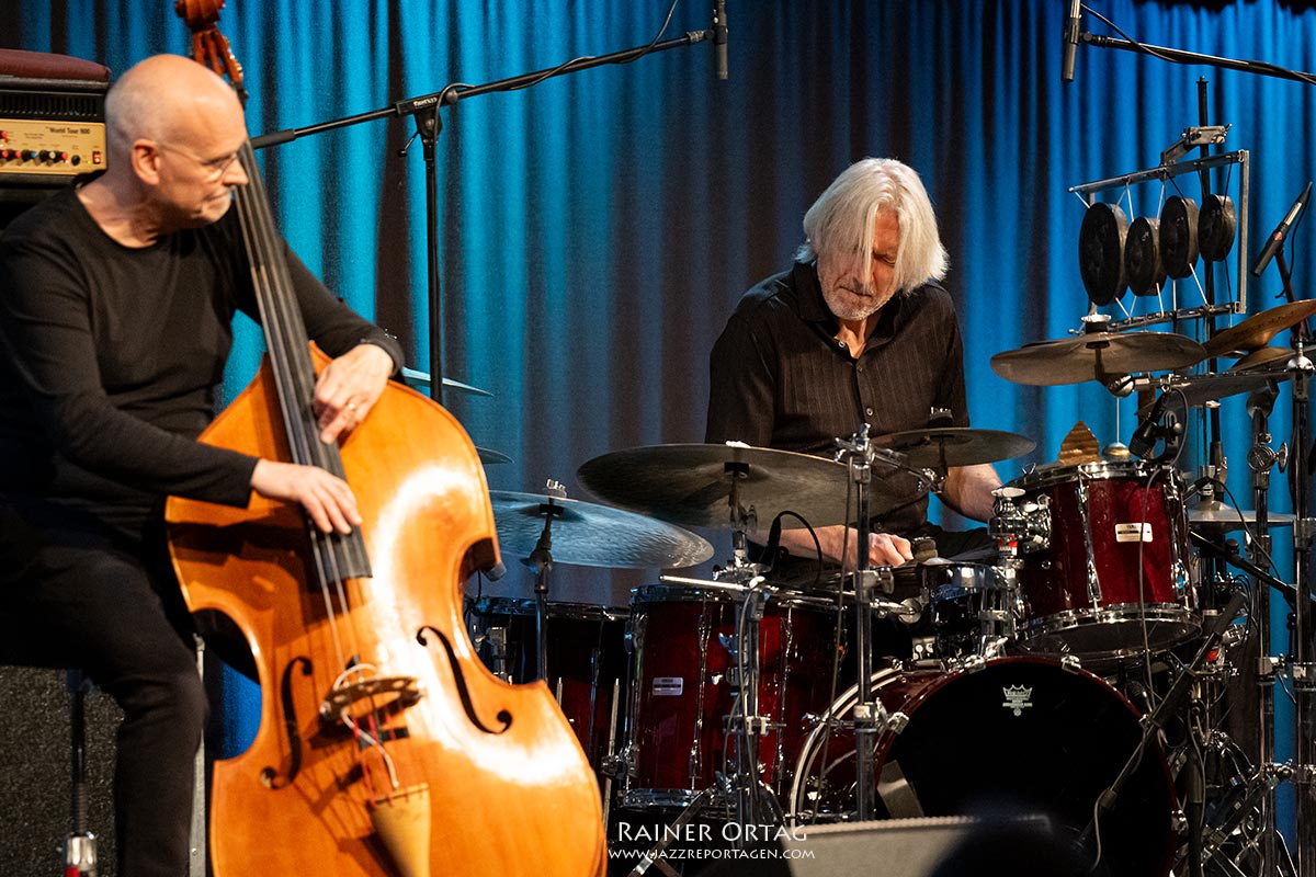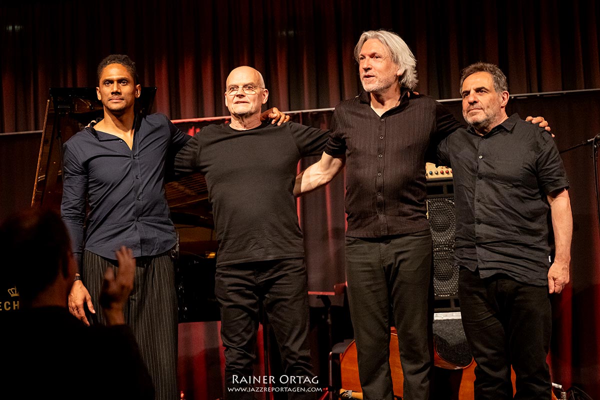 Es ist schier unglaublich welche Töne Danielsson seinem Instrument immer wieder von Neuem entlockt. Ob elektronisch verzerrt, sanft gestrichen, geschlagen oder gezupft, er ist in seiner ganz eigenen Welt des Bassspiels eingetaucht. Besonders bei seinem äußerst lyrischen Solo in dem er Fragmente von „Both sides Now“ der amerikanischen Sängerin Joni Mitchell in allen möglichen Variationen einbaut, ist man berührt und fasziniert zugleich. So manch einem Zuschauer läuft in positiven Sinne bestimmt ein Schauder über den Rücken, ganz nach dem Motto Gänsehaut lügt nie. Aber irgendwie zaubern alle vier Musiker an diesem Abend zusammen jeder für sich an seinem Instrument, und die Alchemie dieser perfekten Instrumentierung ergibt dieses unvergleichliche teils lyrisch, teils rasante Konglomerat des Wohlklangs. Der leider vor einigen Jahren viel zu früh verstorbene schwedische Pianist Esbjörn Svensson hätte seine helle Freude an diesem Konzertabend gehabt, nicht nur weil sein ehemaliger Mitstreiter Jonas Öström seine außergewöhnlichen Fähigkeiten nun in diesem Team einbringen kann, was er gegen Schluss des Abends mit einem fantastischen und äußerst innovativen Solo zeigte. Fragmente des Konzertes waren eine regelrechte Huldigung an das Ebjörn Svensson Trio. Mit dem knackigen und rasanten „Desert of Catanga“ und einer lyrischen besänftigen Zugabe ging ein atemberaubender Konzertabend zu Ende. Eine der „Jazz-Sternstunden“ in den vierzig Jahren des Tübinger Landesjazzfestivals, wie von einigen Zuschauern zu hören war. Apropos Wunschkonzert, ich könnte mir vorstellen, dass viele der Besucher des Abends bestimmt den Wunsch hätten, dieses Konzert noch einmal erleben zu können und selbst für mich, der seit 1973 Jazzkonzerte besucht, war dieser Abend ein absolutes Highlight in den letzten 50 Jahren. Chapeau Liberetto!