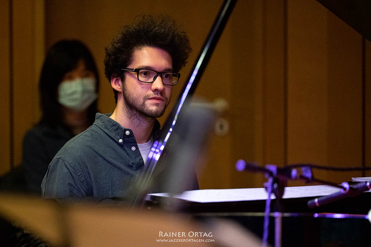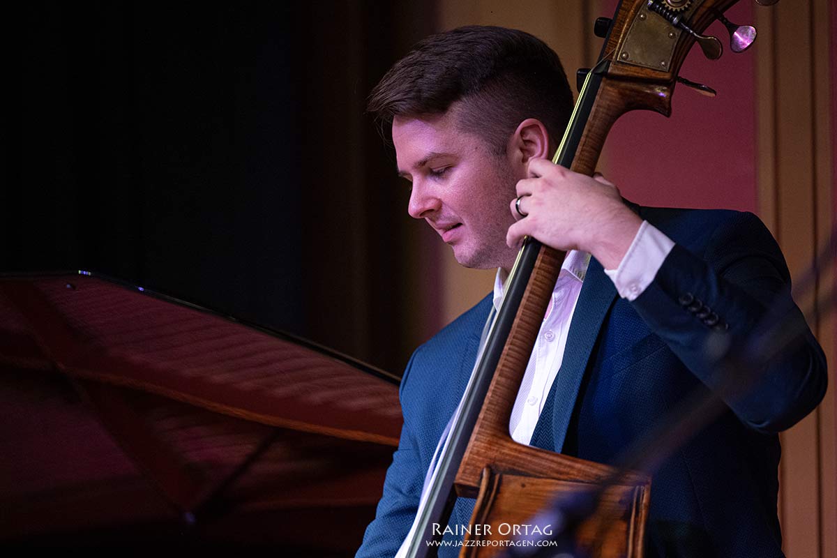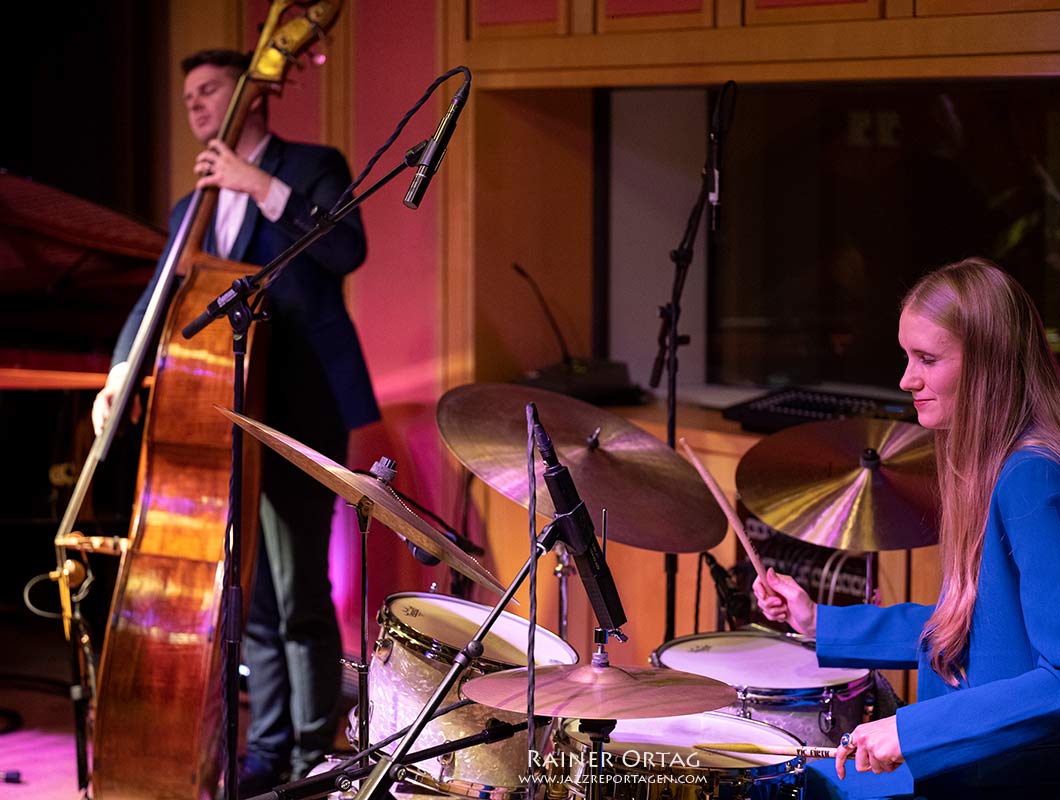 Die Konzerte, die der Tübinger Jazzclub seit über zwanzig Jahren regelmäßig im SWR – Studio veranstaltet haben einen ganz eigenen Charakter. Sie sind – wenn man so will – so was wie unplugged und extra dry. Es gibt keine Beschallung, keinen Hall, nur den ‚nackten‚, ‚puren‚ Sound und Publikum, das den Musiker*innen buchstäblich auf die Finger sehen kann; und auf der anderen Seite der Scheibe das Pult für die Aufnahme. Lisa Wilhelm und ihr Quartett kamen gut an in dieser fast schon intimen Atmosphäre, sie verstanden es den Raum auszufüllen und zu beleben. Ziemlich gegen Schluss präsentierten sie eine Art `Auftragsproduktion` des Senders, der den jungen Bands aus dem Umfeld der Hochschulen des Landes die Interpretation eines Schlagers auferlegt. Sehr elegant fügte sich da Lisa Wilhelms Version von Marlene Dietrichs `Ich weiß nicht, zu wem ich gehöre` ein in die Setlist des Quartetts. Und eigentlich hätte man ewig weiter wachträumen können in diesem Flow und mit diesen wunderbar zusammenspielenden jungen Klangflusskünstler*innen.