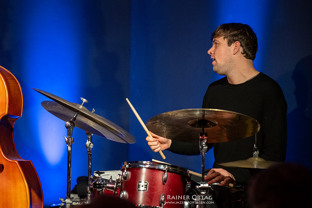 Makar Novikov, der nicht nur als Bassist, sondern auch als Komponist des Abends glänzte, führte das Quartett mit seinem meisterhaften Spiel und seinen Kompositionen durch die Nacht. Seine Musik, die sowohl tiefgründig als auch energiegeladen war, bot immer wieder unerwartete Wendungen und spannende rhythmische Strukturen. Besonders sein Bassspiel, das von Präzision und Emotion gleichermaßen geprägt war, setzte den klanglichen Rahmen für die gesamte Darbietung.
