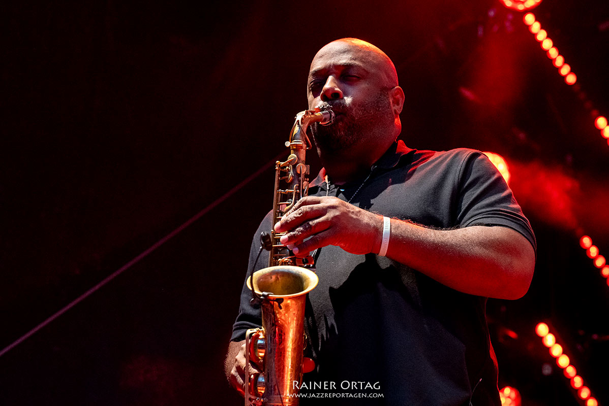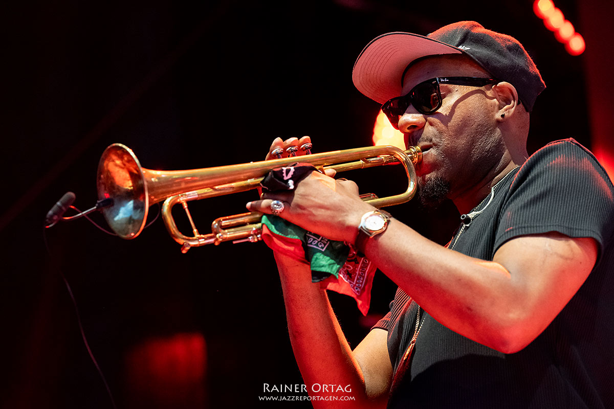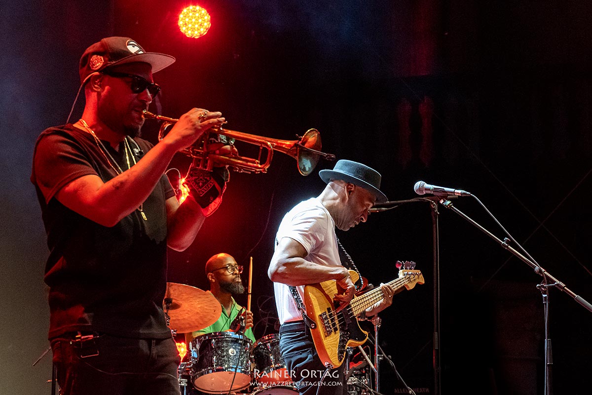 Rhythmisch gibt es jedoch auch Fast Swing Elemente, bei denen, allen voran, Pianist Xavier Gordon seine Klasse unter Beweis stellen kann. Das darauffolgende Trompetensolo á capella von Russel Gunn Jr. lässt die Besucher den Atem anhalten, bevor es nochmals in die Vollen geht. Miller beschwört in der Anmoderation in einer seiner stärksten Nummern „Gorée“, die er aus einer Senegalreise mitgebracht hatte, den „Strong Spirit“ der versklavten afrikanischen Ahnen, die sich nichts sehnlicher als den Frieden wünschten.