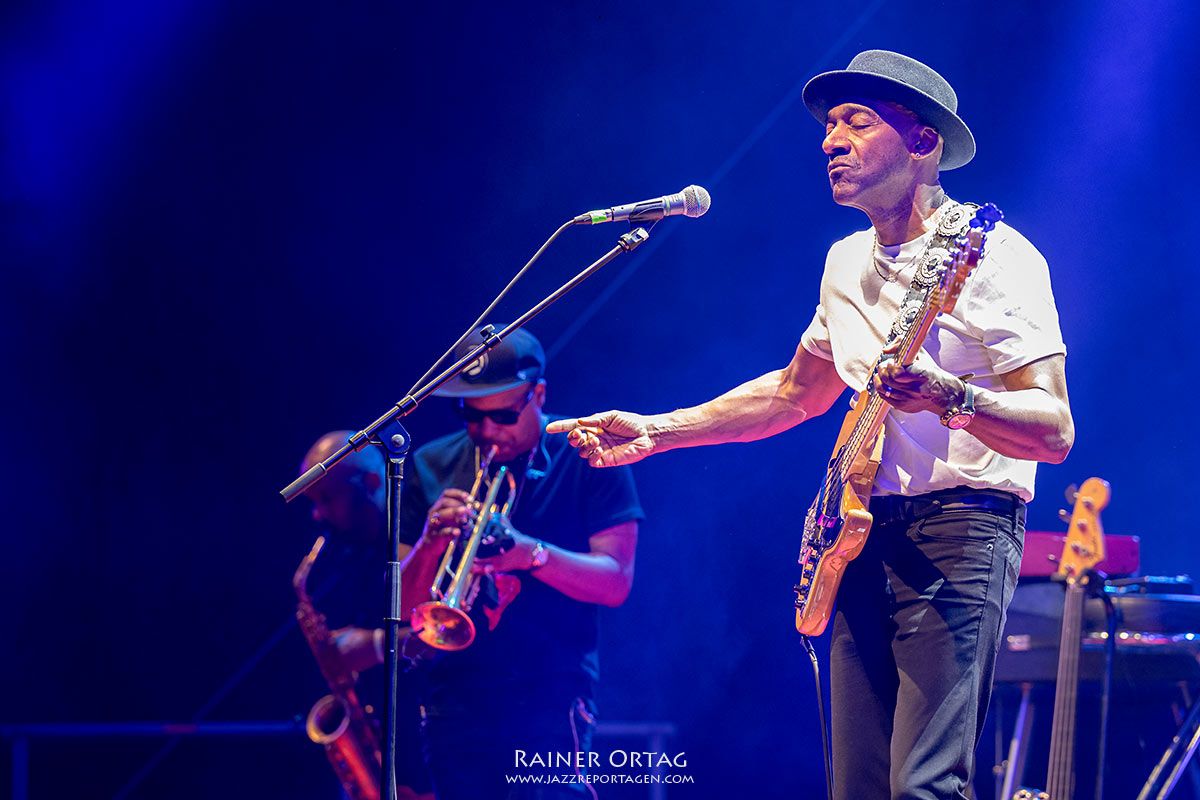 Der Mann allein schon ist ein Orkan an seinem Instrument. Wenn ihm dann noch eine kompetente Band den Soundteppich ausrollt, hält kein Fuß mehr still. Kein Wunder, dass bereits viele Jazzgrößen auf ihn aufmerksam wurden. Die Liste derer, mit denen er zusammengearbeitet hat, ist lang. Exemplarisch seien deshalb nur folgende große Namen erwähnt: Aretha Franklin, Miles Davis, David Sanborn und McCoy Tyner. Noch Fragen? Falls ja, hat Marcus Miller diese am Montagabend im Alten Schloss eindrücklich beantwortet. Mit einem Basssolo-Intro zeigt er umgehend wo der (Bass-) Bartel den Most holt. Slap-Techniken deuten an, auf welche Reise sich das Publikum einstellen darf.