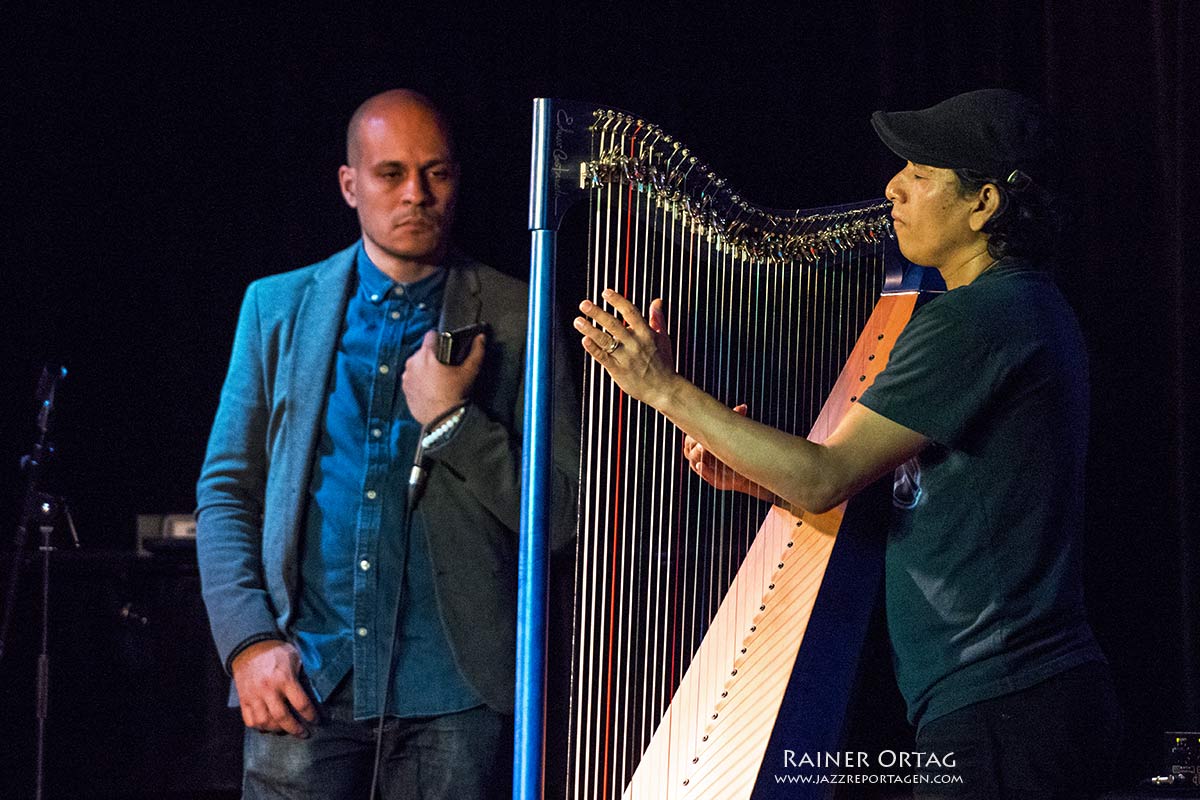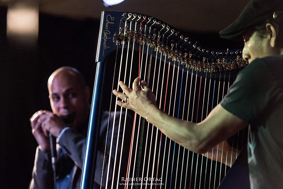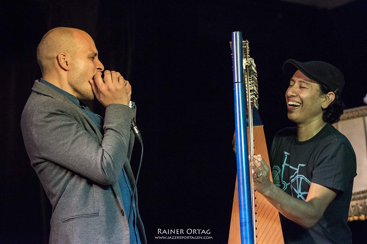 Viele verbinden die Mundharmonika noch heute mit quietschenden Tönen, mit dumpfen Volksmusikgelagen und melancholischen Heimatabenden. Doch diese unbegründeten Vorurteile hat der in Genf aufgewachsene und seit Jahren in New York lebende Grégoire Maret hinlänglich entkräftet. Mit Hilfe dieses Instruments hat es der Schweizer geschafft, an die Seite der Jazzelite von Jacky Terrasson über Steve Coleman und Herbie Hancock bis zu Pat Metheny zu gelangen. Auch bei seinem Duopartner Edmar Castañeda, auf den er zum ersten Mal 2013 beim Monte Carlo Jazzfestival traf, stehen Größen wie Paquito D’Rivera, John Scofield und Wynton Marsalis in der Vita. Wie Maret lebt der Kolumbianer Castañeda in New York und spielt ebenfalls ein absolutes Außenseiterinstrument im Jazz: eine 30 Jahre alte Harfe mit 32 diatonischen Saiten (Arpa Llanera).