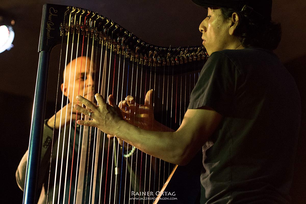 Bei ihrem Auftritt im Pappelgarten geben sich die beiden Musiker ähnlich unkonventionell wie das ihre Biografie verspricht. Aus zum Teil bekannten Stücken entwickeln sie kleine Symphonien, interpretieren mal Paco Pastorius, Astor Piazzolla oder auch Charlie Haden und Pat Metheny mit der wunderschönen Ballade „Our Spanish Love Song“. Es gibt nicht viele Musiker im Jazz, momentan neben Castañeda wohl tatsächlich niemanden, dem die Klänge auf der Konzertharfe wie von selbst zu entströmen scheinen, allein aus sich heraus, mal poetisch sanft, mal bedrohlich und schrill. Bemerkenswert an seinem Spiel ist vor allem, wie er sowohl die der Harfe so charakteristischen sanften Zupftöne voll auskostet und im nächsten Augenblick in die rhythmische Lebendigkeit des Jazz förmlich hineinspringt, indem er seine Harfe etwa als Trommel umfunktioniert oder wie einen Kontrabass klingen lässt.
