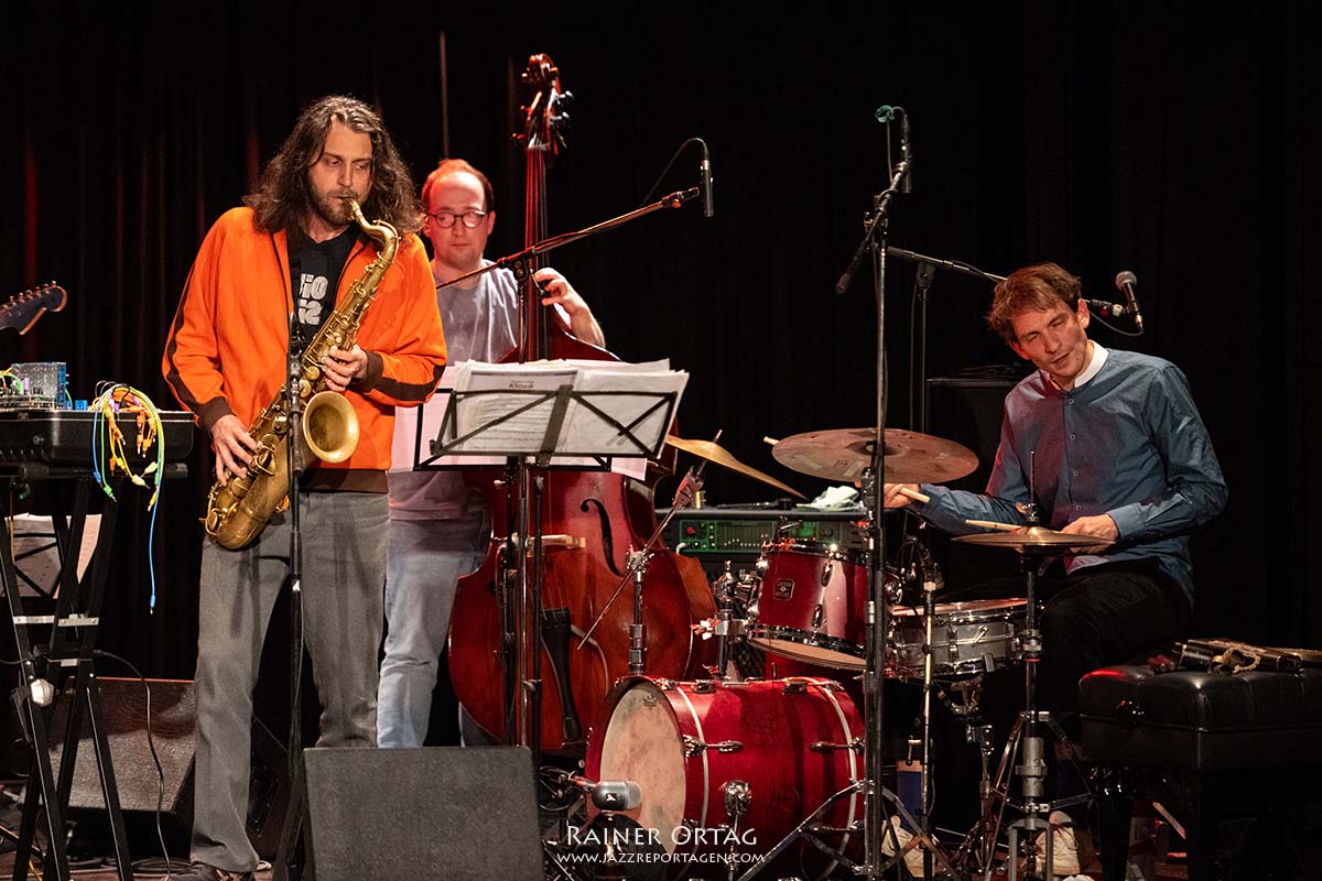 Der Eindruck verlässt mich nicht, dass Max Andrzejewskis Hütte mit der Musik Robert Wyatts menschliche Zeiten mit einem Pflug umgräbt. Dies kann wohlweislich nicht ohne Mühe geschehen – und streckenweise klingt auch ebenso das Klanggefüge der Band – man möchte meinen, ein improvisatorischer Ausbruch aus Noise, Geräuschen und Klängen käme einmal irgendwann wirklich im Laufe des Abends in Esslingen – doch nein, ein wenig Staub blieb konstant bremsend an der Oberfläche, was mich im Anschluss etwas nachdenklich zurückließ. Reibung erzeugt bekanntlich Wärme – das ist nicht das Schlechteste, was Musik erreichen kann.