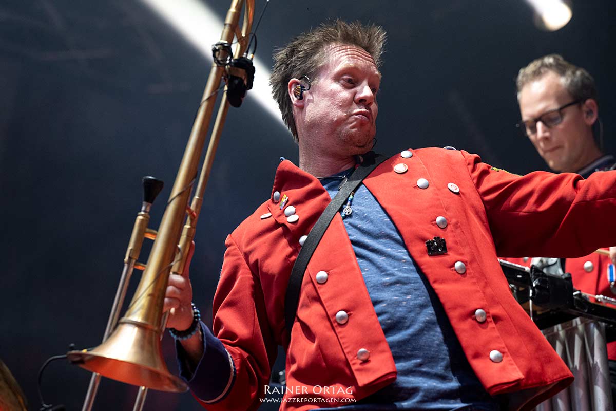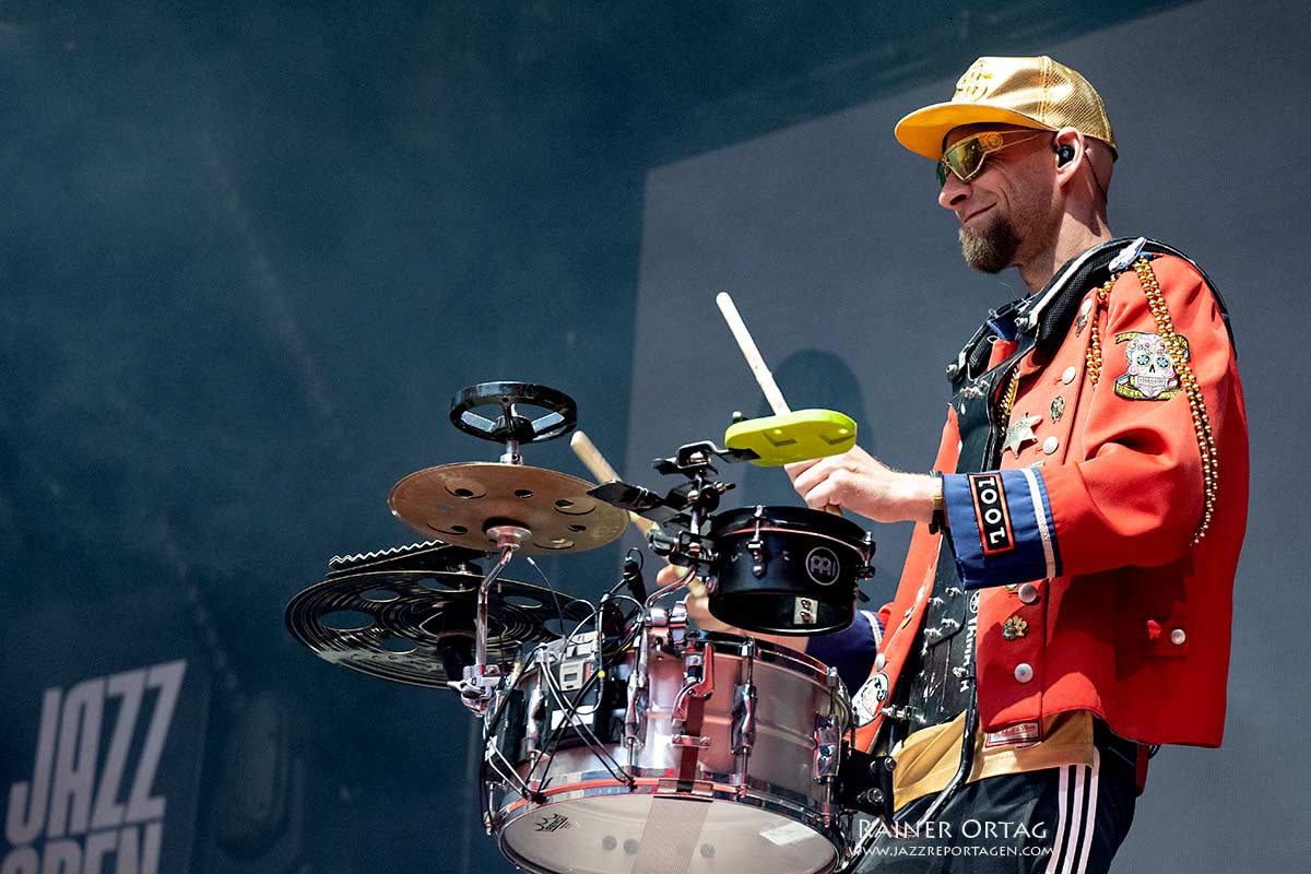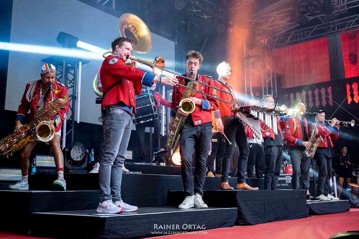 Die Massen im Schlosshof bewegten sich wie in Trance, ausgelassen und voller unbeschwerter Freude, abseits der alltäglichen Sorgen. Was im Grunde als völlig unvereinbar galt, die Synthese von Technosound und einem Blasorchester, sorgt an diesem Abend in beeindruckender Weise für einen der musikalischen Höhepunkte der letzten Jahre bei den Jazz Open. Man vermag sich kaum vorzustellen, welchen Effekt solch ein Auftritt im großen Schlosshof mit 7000 Menschen hätte. Zukunftsmusik? Wer weiß, vielleicht schon bald Wirklichkeit in nahe Zukunft.