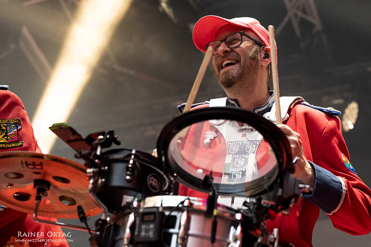 Diese Art von Ekstase gab es wohl seit es die Jazz Open im Alten Schloss gibt so noch nie. Eine Blaskapelle die gut 1200 Zuhörer in ekstatische Bewegung versetzt. Eine Blaskapelle? Eigentlich nicht vorstellbar. Doch dem deutsche Ensemble Meute gelingt es vom ersten Ton an die Masse, im erstmals unbestuhlten Schlosshof zum Tanzen zu bringen. Wehe wenn die Meute losgelassen wird, dann fegt die Abrissbirne, oder besser gesagt bläst ein Tornado durch die Konzertsäle oder, wie in Stuttgart, durch den Schlosshof.
