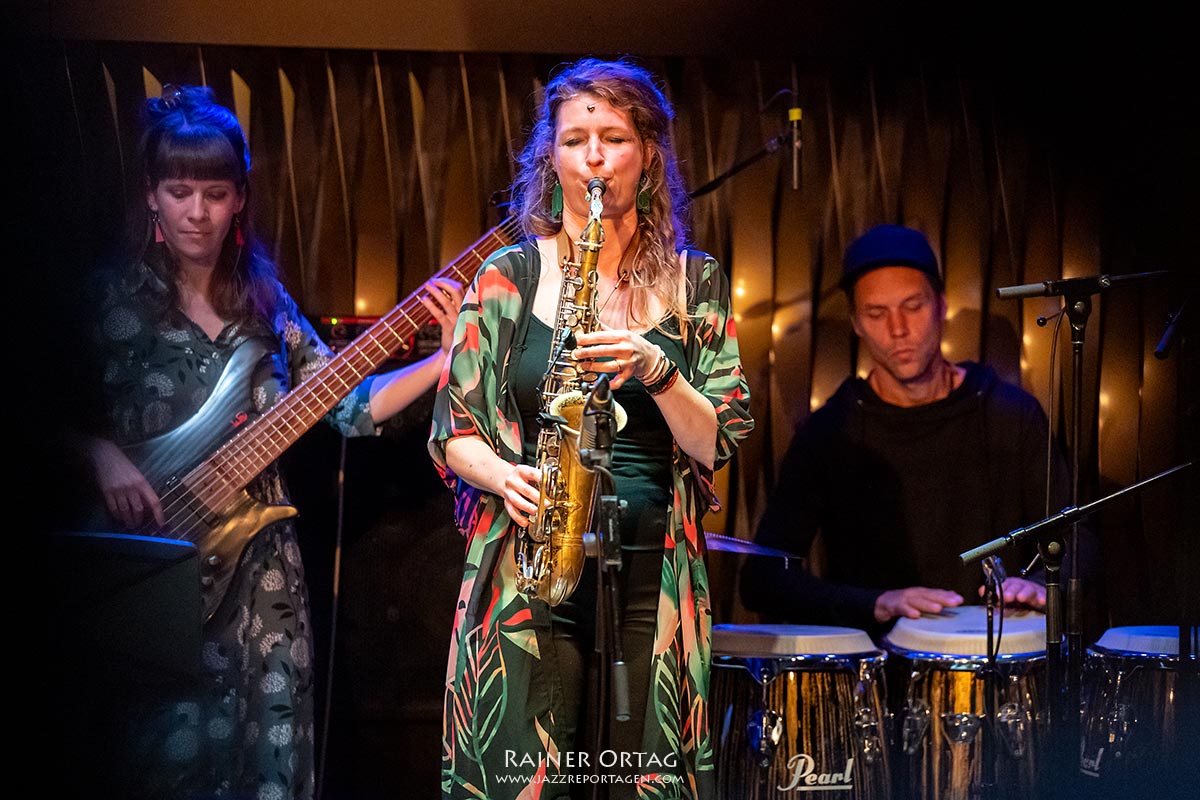 So der Text der Ankündigung. Und man hat nicht zu viel versprochen! Nicole Johaenntgens „Robin“, bereits 2016 mit anderer Besetzung in Brooklyn aufgenommen, nimmt mit… Fast beneidet man die Zuhörer, die im vollen Club nur mehr einen Stehplatz bekommen haben. Die vielfach mit nationalen und internationalen Preisen ausgezeichnete Nicole Johaenntgen hat für dieses Projekt eine eigene Band zusammengestellt. Am Piano die Freiburger Pianistin Manon Mullener, die im Januar diesen Jahren zum Jazzfestival in Havanna eingeladen war. Den eBass spielte die junge, in Bern lebende, Bassistin Sonja Bossart sehr souverän. Gleich zwei hervorragende Percussionisten, David Stauffacher und Roberto Hacaturyan, sorgten sehr gekonnt für den Rhythmus, bei dem man mit muss ;).