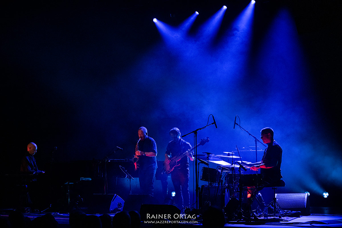 Schwarze Bühne, weißer Rauchteppich, effektvoll platzierte Scheinwerfer – das Oktober – Konzert im gut besuchten Sudhaus startet nach einer Piano – Cluster – und Drone – Bass – Sequenz und mündet in einen recht rockigen Opener. Schnelle, hämmernde Piano – Akkorde, immer wieder Einsprengsel und Breaks der drei Mitspieler, und eben keine Soli wie sonst im Jazz üblich. Es sind eher kurze Melodie Partikel, Motiv – Skizzen, Jonglierbälle, die hier hin – und herfliegen, dabei eine gemeinsame Musik entstehen lässt. Die Band schickt das Publikum mit manchmal schier aushaltbarer Spannung und hypnotischen Beats und auf faszinierte Reisen.