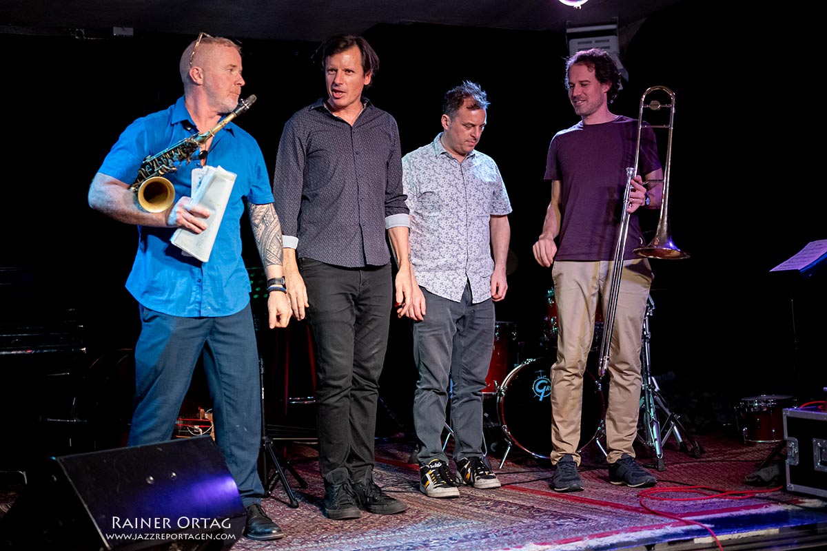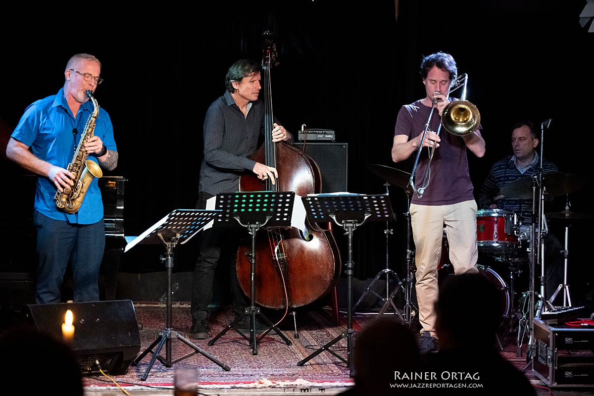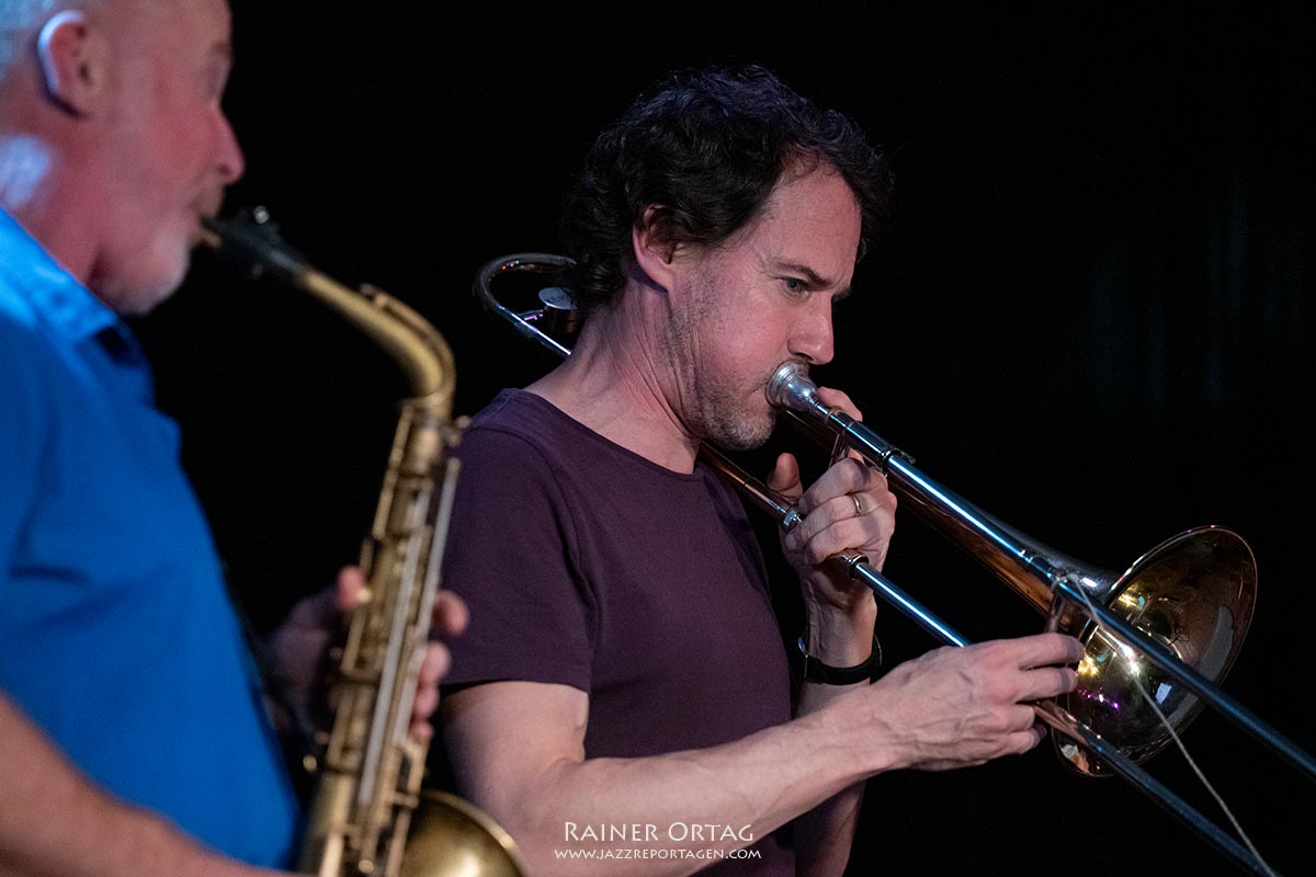 Das Quartett Root 70 besteht seit 23 Jahren und ist so eine Art homeband des Braunschweiger und mindestens europaweit gefeierten Posaunisten Wogram, der bei diesem Konzert in Reutlingen vor allem Stücke aus der eben erschienen CD des Ensembles präsentiert. The ‘Pristine Sound of Root 70’ heißt es, verspricht also was Edles, eben Makelloses. Der Verzicht auf das Piano oder ein anderes Harmonieinstrument legt die Strukturen der Musik offen dar und macht sie jederzeit und unmittelbar sicht- bzw. hörbar. In ‘Kairos’ swingt und groovt das Quartett, immer mal wieder greift Wogram zur Melodica oder er kreiert wunderbar verzogen – verzerrte Posaunensound mit dem Dämpfer. Natürlich kann man sich an Albert Mangelsdorff erinnert fühlen, aber Root 70 hat eben seinen ureigenen Klang. Aus dem Zusammenspiel der beiden Bläser erwachsen ständig neue Figuren und Melodien. Ein runder, melodischer Bass gespielt von Matt Penman, dem zweiten Neuseeländer in der Band und Jochen Rückert legen dabei die Basis. Aber sie sind auch immer wieder bereit für eigene Soloausflüge, unter den dann die Bläser einen wunderschön tönenden Klangteppich legen.