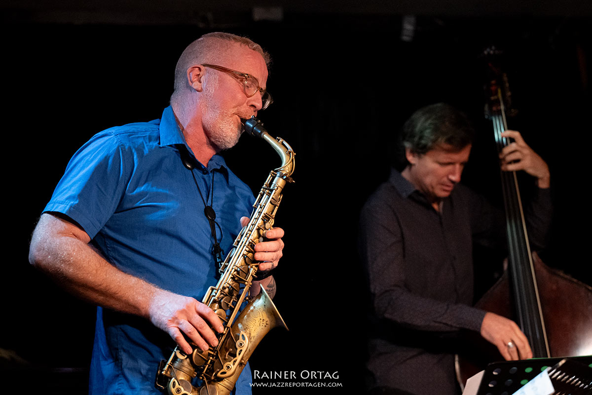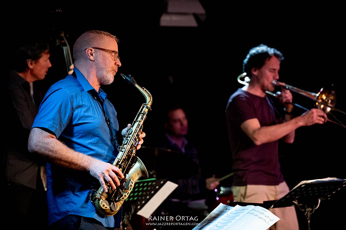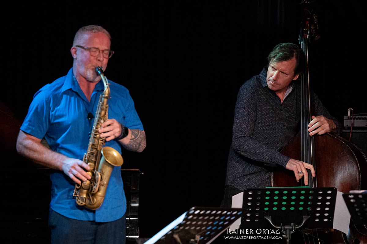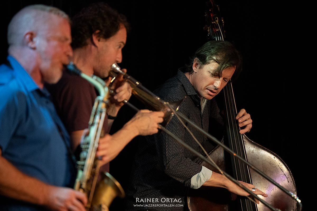 Das Quartett Root 70 besteht seit 23 Jahren und ist so eine Art homeband des Braunschweiger und mindestens europaweit gefeierten Posaunisten Wogram, der bei diesem Konzert in Reutlingen vor allem Stücke aus der eben erschienen CD des Ensembles präsentiert. The ‘Pristine Sound of Root 70’ heißt es, verspricht also was Edles, eben Makelloses. Der Verzicht auf das Piano oder ein anderes Harmonieinstrument legt die Strukturen der Musik offen dar und macht sie jederzeit und unmittelbar sicht- bzw. hörbar. In ‘Kairos’ swingt und groovt das Quartett, immer mal wieder greift Wogram zur Melodica oder er kreiert wunderbar verzogen – verzerrte Posaunensound mit dem Dämpfer. Natürlich kann man sich an Albert Mangelsdorff erinnert fühlen, aber Root 70 hat eben seinen ureigenen Klang. Aus dem Zusammenspiel der beiden Bläser erwachsen ständig neue Figuren und Melodien. Ein runder, melodischer Bass gespielt von Matt Penman, dem zweiten Neuseeländer in der Band und Jochen Rückert legen dabei die Basis. Aber sie sind auch immer wieder bereit für eigene Soloausflüge, unter den dann die Bläser einen wunderschön tönenden Klangteppich legen.