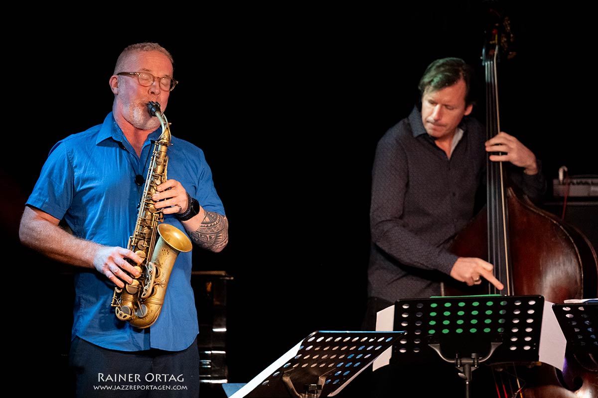 Zehn Minuten später: die Adventskranzkerze flackert lebendig, als die beiden Bläser mit einem Tief – Ton – Thema das Konzert eröffnen. Voll, rund und kraftvoll der Sound, zunächst verhalten das Tempo, dann legt das Quartett ab. Mal klingen Nils Wolgram an der Posaune und der Neuseeländer Hayden Chrisholm am Altsaxofon wie eine ausgewachsene Bläsersektion einer Bigband, im nächsten Augenblick weben sie ein feines Flechtwerk an Melodien, Variationen und Improvisationen.
