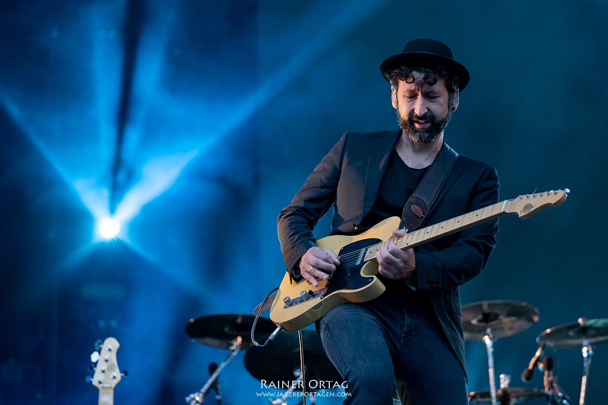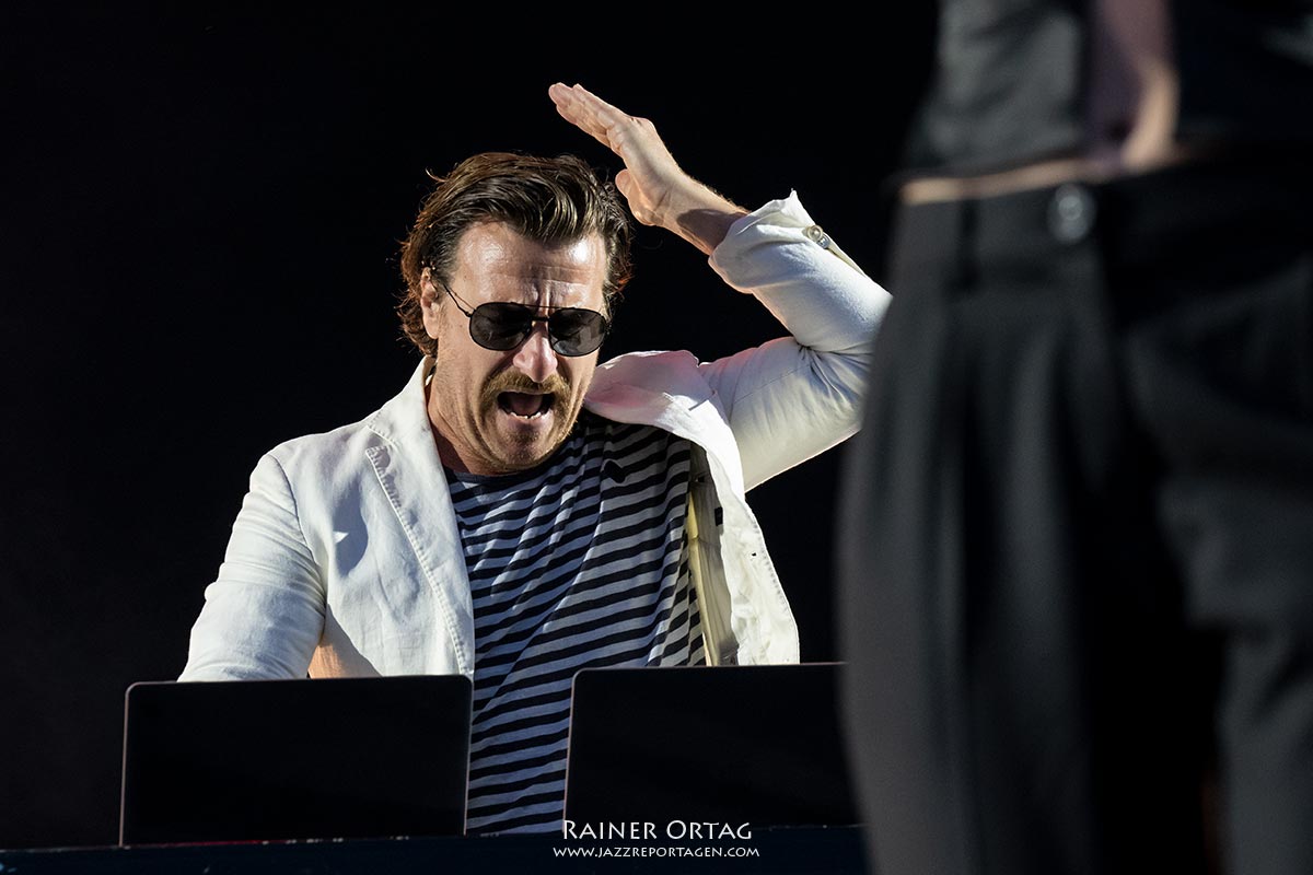 Dirigiert vom genialisch-verstrubbelten Chef hinter seiner Space-Konsole drückt die Combo ihren unentrinnbaren Puls ins tanzfreudige Publikum. Hans Jürgen Bart an den Trommeln liefert stoisch und oft eng an die Samples Parovs gekoppelt den Ruderbeat für die Partygaleere, Michael Wittners solides Bassspiel greift die Versatzstücke der Einspieler auf und führt sie druckvoll fort. Vor dieser schönen Tapete bewegen sich die drei Bläser und Lee Anduze und Elena Karafizi am Mikro, die letzteren mit stimmiger Performance und stets im Kontakt mit dem Publikum. Die perfekt orchestrierte Mischung aus Polkabeats, Swinggrooves, Elektropatterns, Bläsereinlagen und allerlei Samples in Verbindung mit reichlich Dezibel funktioniert: die Menge hopst sich vom ersten Kick der Bassdrum an frei. Trotz des Focus auf Tanzbarkeit bleibt den Musikern immer wieder mal ein Fenster, um sich solistisch zu präsentieren. Michael Wittner weiß seinen Bass zu slappen, Marc Osterer an der Trompete erfreut das Publikum mit einer Call-and-Response-Einlage, immer wieder tritt Sebastian Grimus mit seinem Saxofon ins Licht. Dann wieder: Volles Brett! Parov Stelar, bürgerlich Marcus Füreder, ist mit seinem Projekt schon seit einigen Jahren recht erfolgreich unterwegs. Auch jetzt bei jazzopen als Headliner am Samstagabend punktet er mit seinem kompromisslosen Partykonzept. Das Publikum freut´s. Nach reichlich Zugaben endet der Auftritt einer Band, die den Autor bisweilen an Kid Creole & the Coconuts erinnert, nur mit mehr Strom.