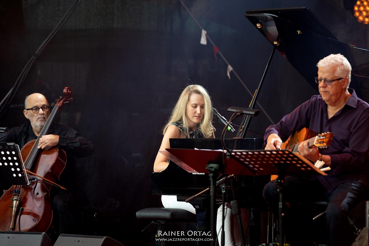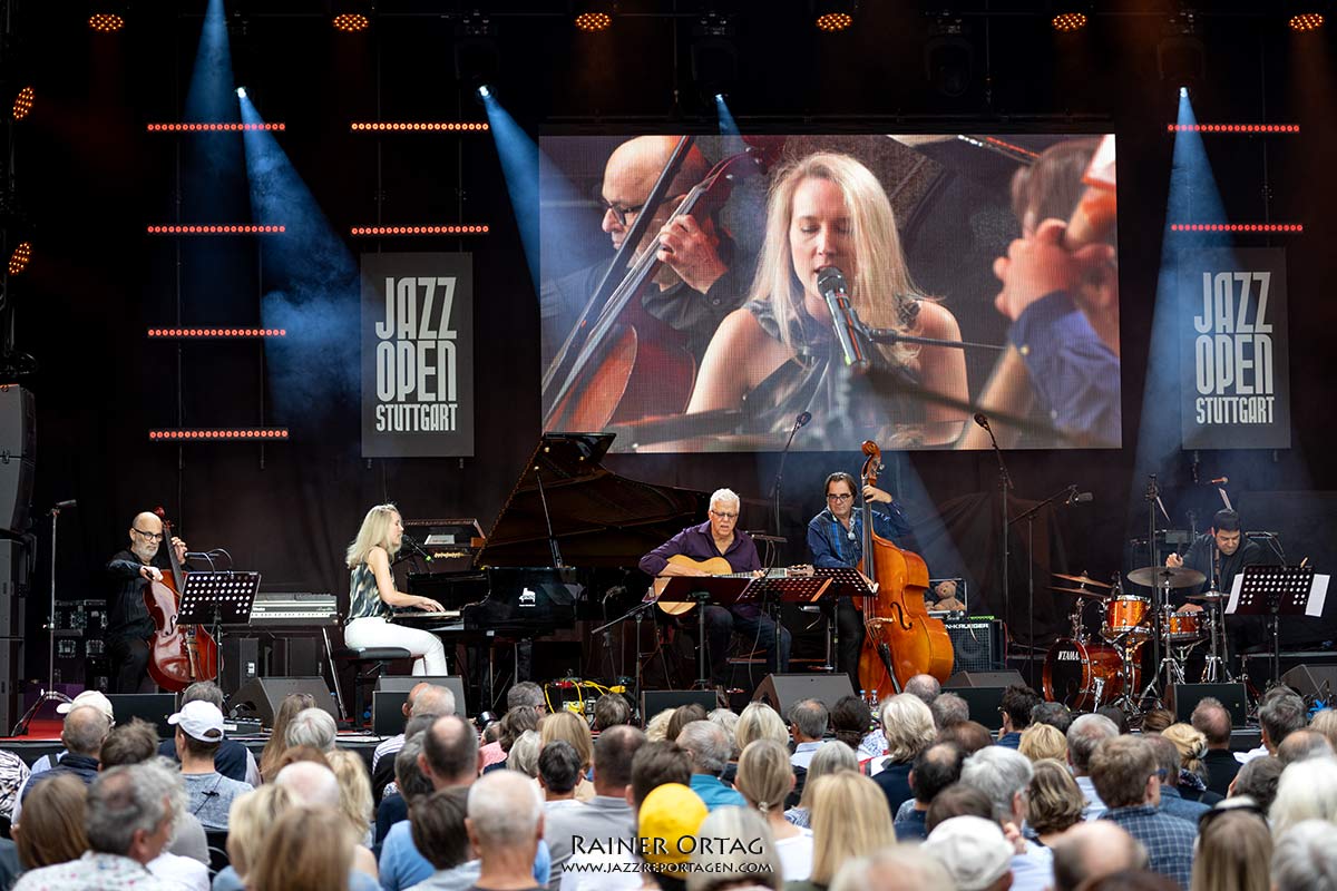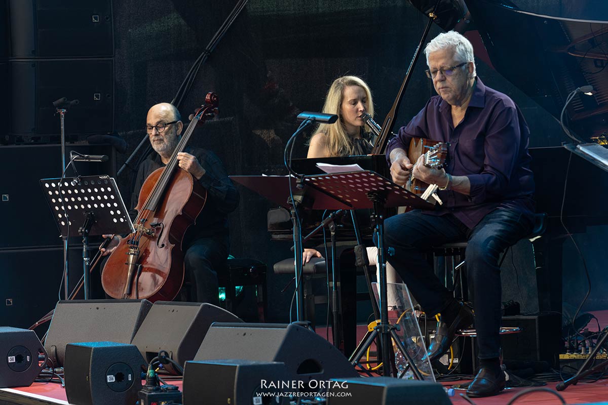 Die Sängerin und Pianistin besticht am 9. Juli beim Stuttgarter jazzopen im Alten Schloss vor allem durch Bühnenpräsenz und ihre authentische Liebe zur brasilianischen Musik. Kein Wunder, hatte sie für dieses Konzert, ihrer Passion entsprechend, ihre brasilianischen „Spielkameraden“ mitgebracht. Und das waren wahrlich keine Nobodys. Stellvertretend sei hier der Cellist Jaques Morelenbaum erwähnt. Morelenbaum? Da war doch etwas….; Paula Morelenbaum, als Sängerin hierzulande vielleicht eher bekannt, ist seine Frau. Nach dem Tode von Jobim 1994 gründete Jaques Morelenbaum gemeinsam mit Paula, Jobims Sohn Paulo (Gitarre und Gesang) und Paulos Sohn Daniel (Klavier und Gesang) das Quarteto Jobim-Morelenbaum. Das Repertoire baute auf dem Schaffen von Antônio Carlos Jobim auf. Letzterer wurde denn auch im Innenhof des Alten Schlosses entsprechend gewürdigt. So kamen vorwiegend dessen Kompositionen zum Zuge. Bereits der Opener „Quiet nights of Quiet Stars“ (Corcovado) versetzte die Besucher in Copacabana-Stimmung. “Chega de Saudade”, “Girl from Ipanema“., „Once I Loved“ und „Wave“ setzten im weiteren Programmverlauf noch eins drauf. Natürlich waren das nicht nur Coversongs, sondern auch neue Arrangements der Brazil-Hits. Leicht schwebende Piano-Solos, Zweistimmige Licks von Piano und Cello, hervorragende Bass-, Gitarren- und Drumsoli, die aufhorchen ließen und die wundervolle Bogenführung von Morelenbaum erhöhten den Genuss der Latin Grooves.