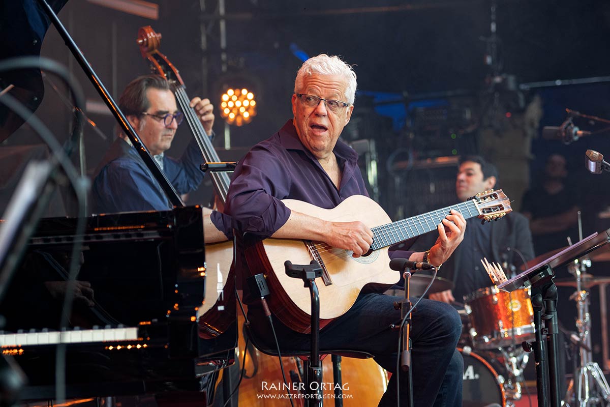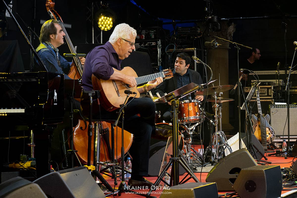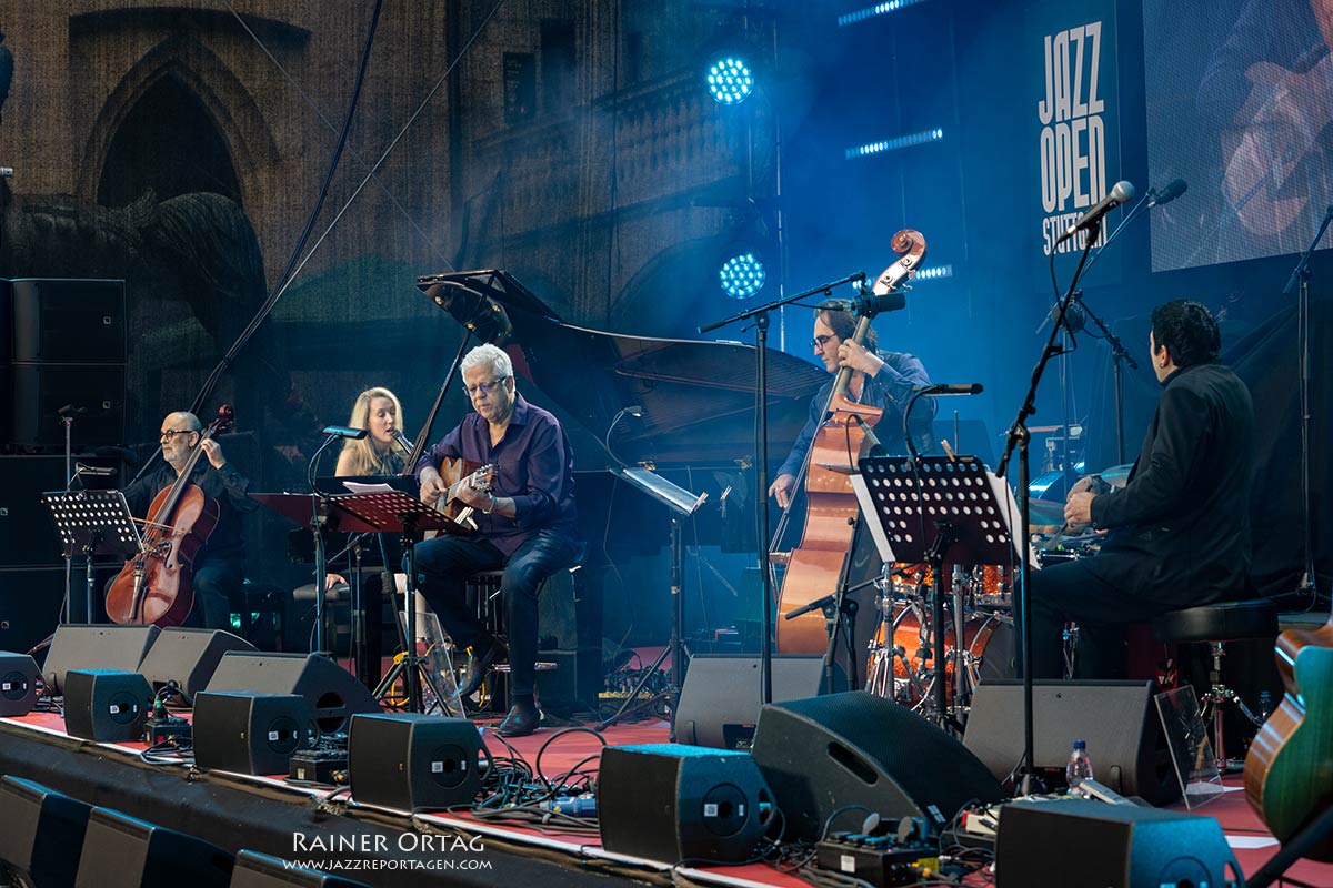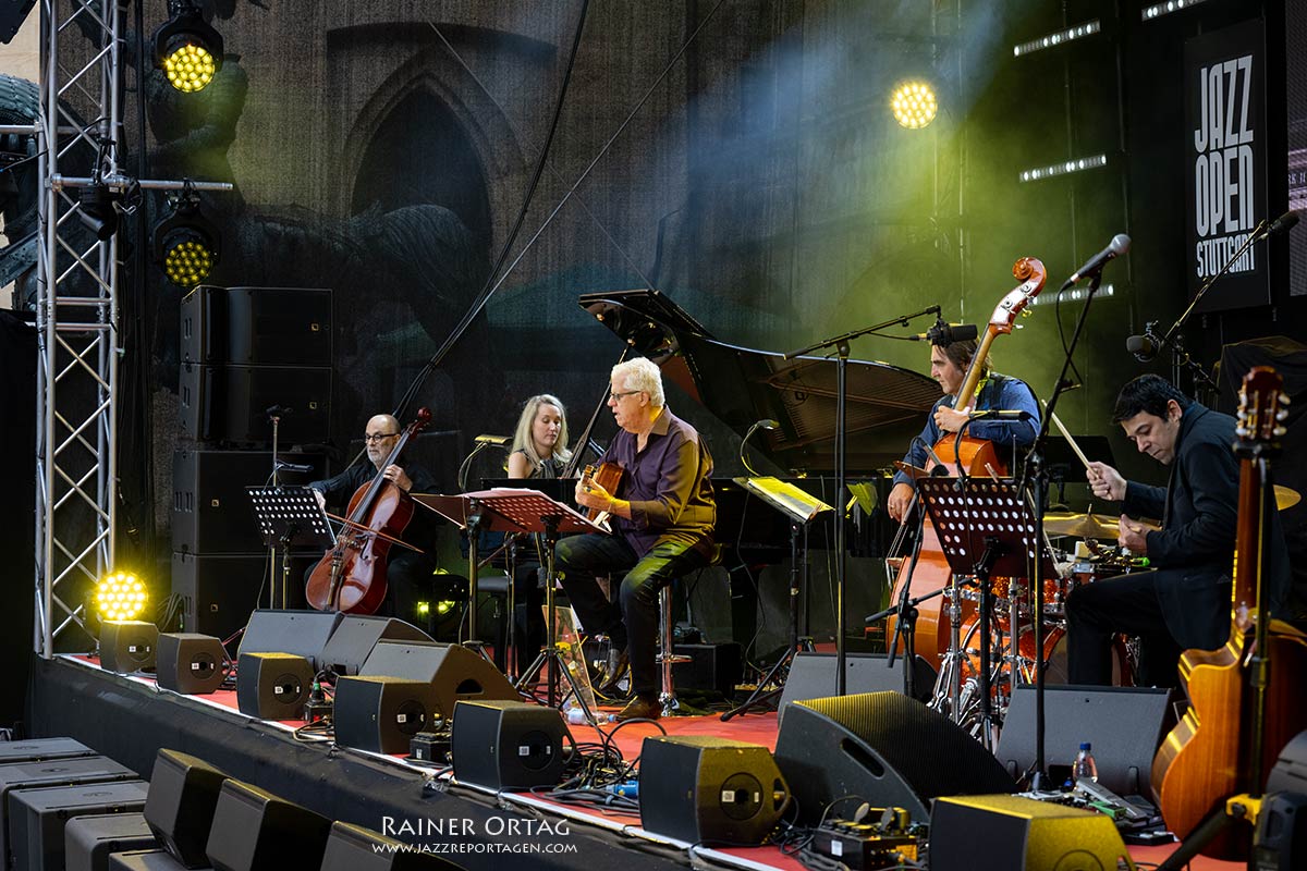 Die Sängerin und Pianistin besticht am 9. Juli beim Stuttgarter jazzopen im Alten Schloss vor allem durch Bühnenpräsenz und ihre authentische Liebe zur brasilianischen Musik. Kein Wunder, hatte sie für dieses Konzert, ihrer Passion entsprechend, ihre brasilianischen „Spielkameraden“ mitgebracht. Und das waren wahrlich keine Nobodys. Stellvertretend sei hier der Cellist Jaques Morelenbaum erwähnt. Morelenbaum? Da war doch etwas….; Paula Morelenbaum, als Sängerin hierzulande vielleicht eher bekannt, ist seine Frau. Nach dem Tode von Jobim 1994 gründete Jaques Morelenbaum gemeinsam mit Paula, Jobims Sohn Paulo (Gitarre und Gesang) und Paulos Sohn Daniel (Klavier und Gesang) das Quarteto Jobim-Morelenbaum. Das Repertoire baute auf dem Schaffen von Antônio Carlos Jobim auf. Letzterer wurde denn auch im Innenhof des Alten Schlosses entsprechend gewürdigt. So kamen vorwiegend dessen Kompositionen zum Zuge. Bereits der Opener „Quiet nights of Quiet Stars“ (Corcovado) versetzte die Besucher in Copacabana-Stimmung. “Chega de Saudade”, “Girl from Ipanema“., „Once I Loved“ und „Wave“ setzten im weiteren Programmverlauf noch eins drauf. Natürlich waren das nicht nur Coversongs, sondern auch neue Arrangements der Brazil-Hits. Leicht schwebende Piano-Solos, Zweistimmige Licks von Piano und Cello, hervorragende Bass-, Gitarren- und Drumsoli, die aufhorchen ließen und die wundervolle Bogenführung von Morelenbaum erhöhten den Genuss der Latin Grooves.