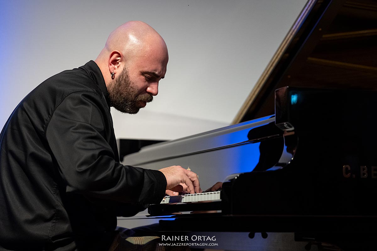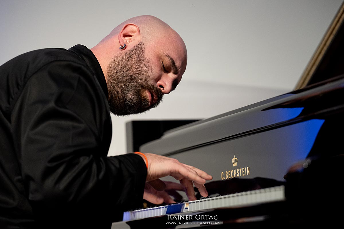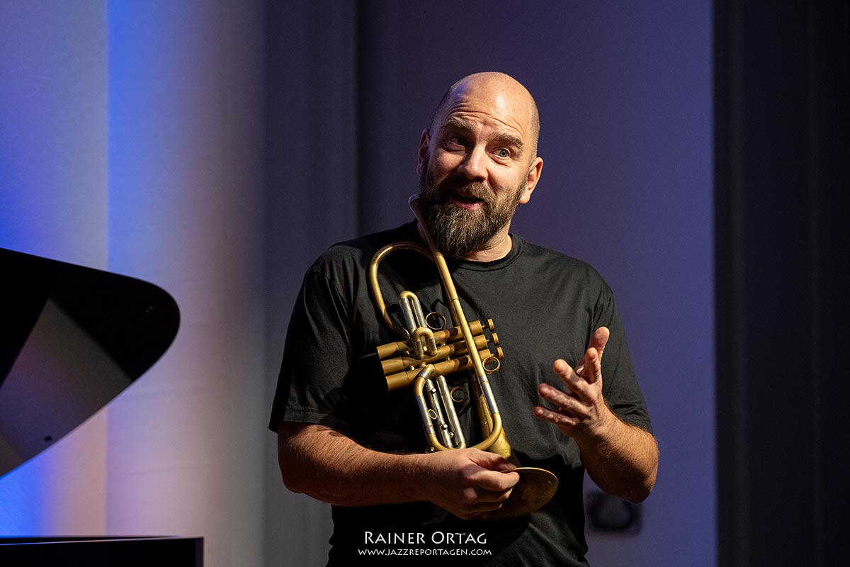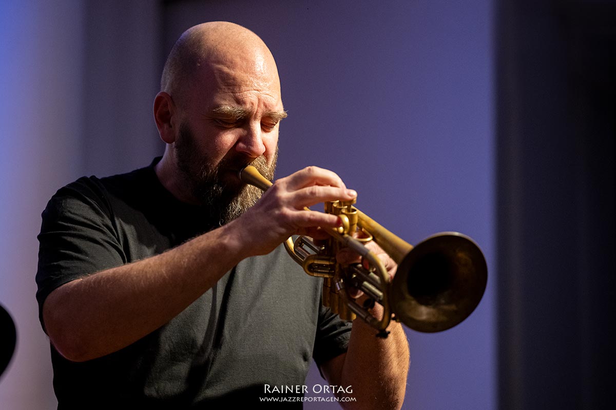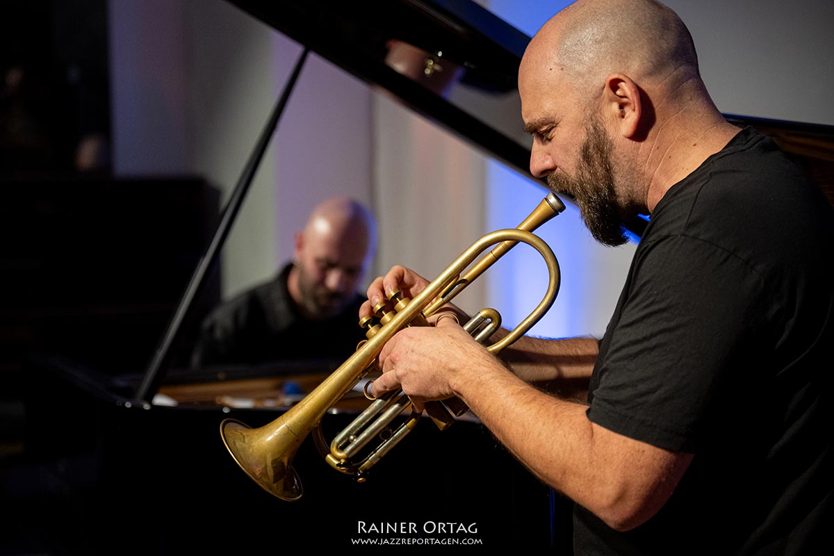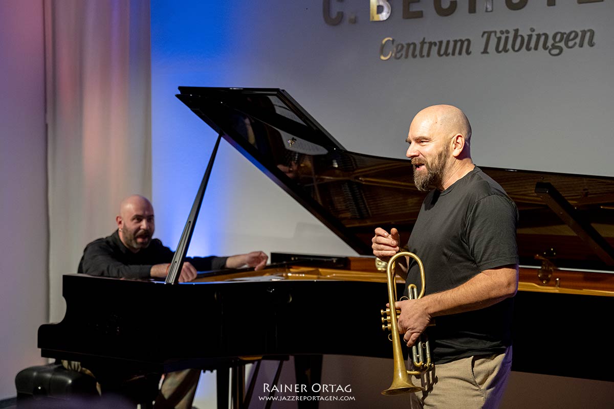Wieder mal ist es dem Tübinger Jazzclub gelungen, Musik mit außergewöhnlicher Tiefenwirkung auf die Bühne zu bringen.  Der Auftritt dieses ukrainisch – deutschen Duos ist ein Konzert, in dem mehr als “nur“ Musik erklingt. „Vor ein paar Tagen ist Andrii aus Kiew hier angekommen“, erzählt Sebastian Studnitzky, und sofort beginnen Bilder zu entstehen, zu den Fragen, die jede*n umtreiben. Zum Beispiel: Wie geht das, in Kriegszeiten Musik zu machen, in Kiew, und dann auch noch solch eine zarte, einfühlsame Musik wie die, mit der der aus Odessa stammende Andrii Pokaz, dieses Konzert im Tübinger Beschstein Centrum beginnt. Alleine zunächst. Da sind zuerst ganz sachte Tontupfer, mit viel Klangraum, dann beginnt sich die Musik zu strukturieren, fließende aufgelöste Akkorde, die linke Hand schafft einen ruhigen, dennoch bewegten Klangfluss, irgendwann setzt die Trompete ein. Keine scharf geblasenen, eher gehauchte Töne beginnen sich im Raum zu verteilen. Sebastian Studnitzky spielt langgezogene Melodiebögen, wie Atem ist die Luft zu hören, die die Töne erzeugt, über die Lippen, das Mundstück, die Windungen des matt – metallenen Instruments in die Welt schickt.