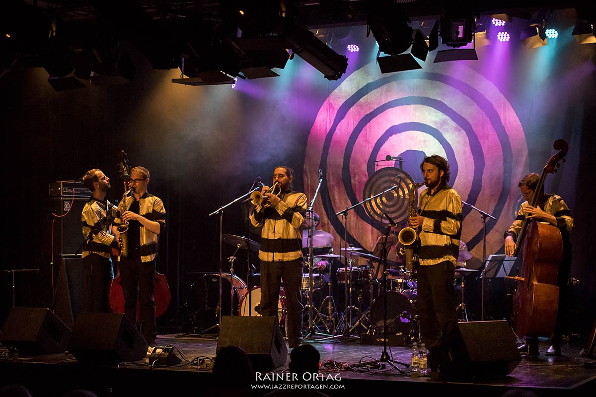 Gemeinsam reflektierten die sieben Musiker die Unübersichtlichkeit der Stile, hauchten dem Jazz neue Impulse ein und setzten dabei auf die Neugier und Toleranz des Publikums. Was in der Dieselstraße rüberkommt, ist experimenteller und ungemein grooviger Jazz auf hohem Niveau. Man versteht sofort, warum die sieben Jazzer Lukas Kranzelbinder (Kontrabass, Guembri), Clemens Salesny (Altsaxofon), Johannes Schleiermacher (Tenorsaxofon), Mario Rom (Trompete), Oliver Potratz (Bass), Christian Eberle (Schlagzeug) und Andreas Haberl (Schlagzeug) bereits vier Jahre nach ihrer Bandgründung in vielen Jazzkreisen als „Kultband“ gehandelt werden.