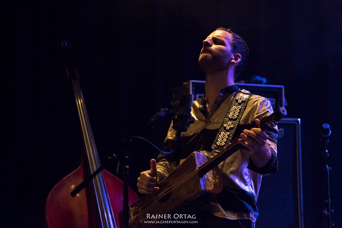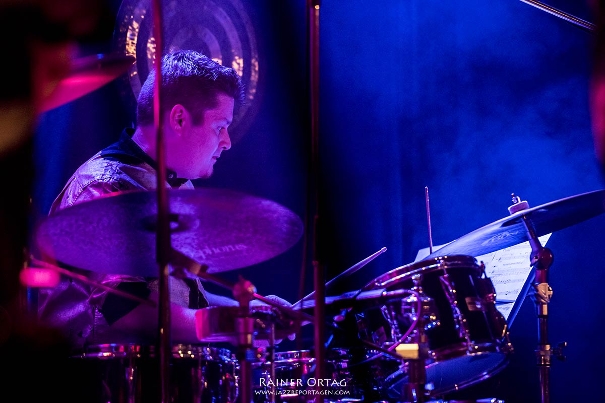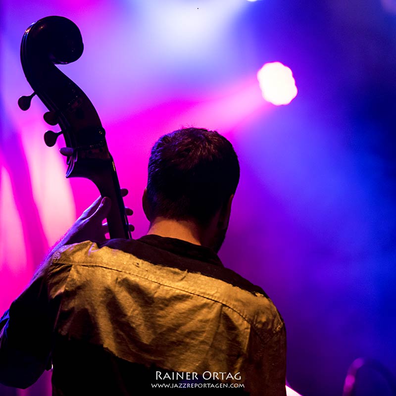 Das liegt nicht nur an der ungewöhnlichen Besetzung mit zwei Schlagzeugen, zwei Bässen und drei Bläsern. Das Septett schafft bei ihrem zweistündigen Auftritt auch eigenwillige Soundgebilde, vor allem das Zusammenspiel zwischen den drei Bläsern und den beiden Kontrabassisten macht Staunen. Sie bestechen immer wieder durch kraftvolle, brillante Läufe und wenn Bandleader Lukas Kranzelbinder mit seiner differenzierten Ausdrucksweise die Melodieführung übernimmt, wirft er vieles über den Haufen und bricht mit einigen Erwartungen, die man dem Bassspiel entgegenbringt. Aber auch das Ensemble als Ganzes versteht es, Tempi und Klangfarben zu variieren und mit ihrem opulenten Sound Spannung zu erzeugen.