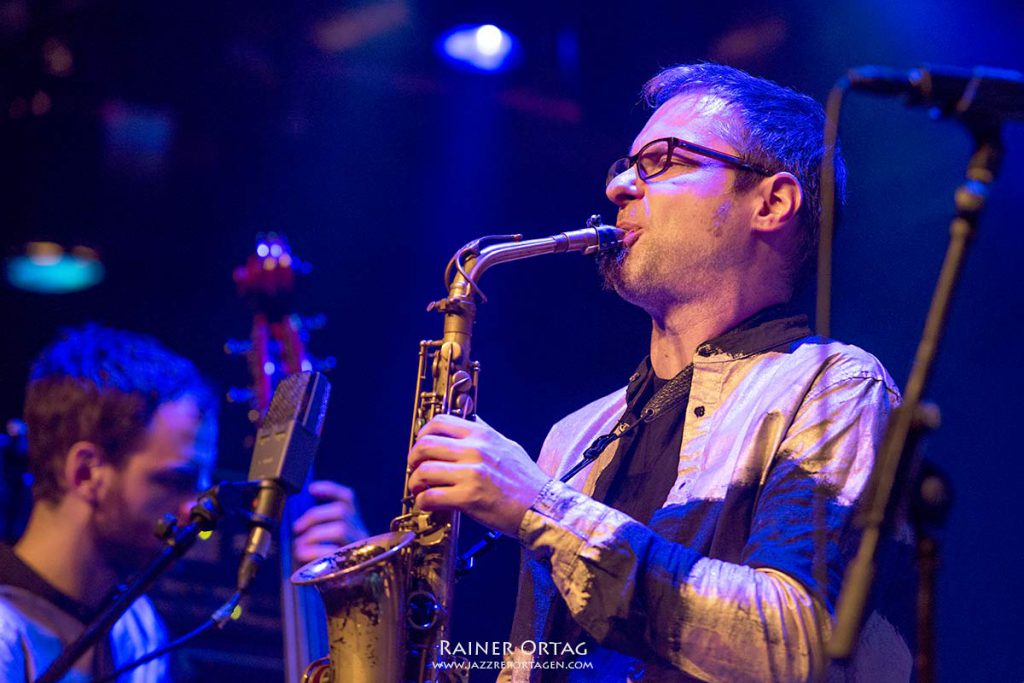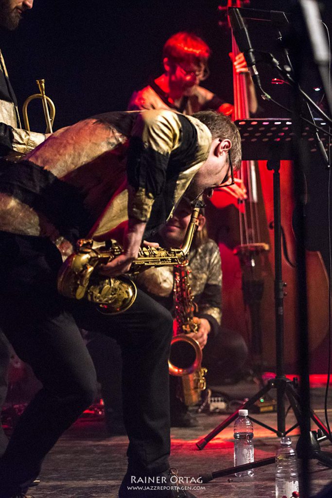 Und darüber die drei Bläser, weich und voll, dann wild expressiv oder hymnisch, einfach unberechenbar. Clemens Salesny, der Altsaxofonist, oft zurückhaltend im Auftritt wie sie alle, aber immer voll bei der Sache. Und dann steigert sich der Tenor-Saxofonist Otis Sandsjö, der kurzfristig eingesprungen und der einzige Musiker auf der Bühne ist, der mit Notenblatt spielt, in ein unglaubliches Solo hinein, das jede Form sprengt.
