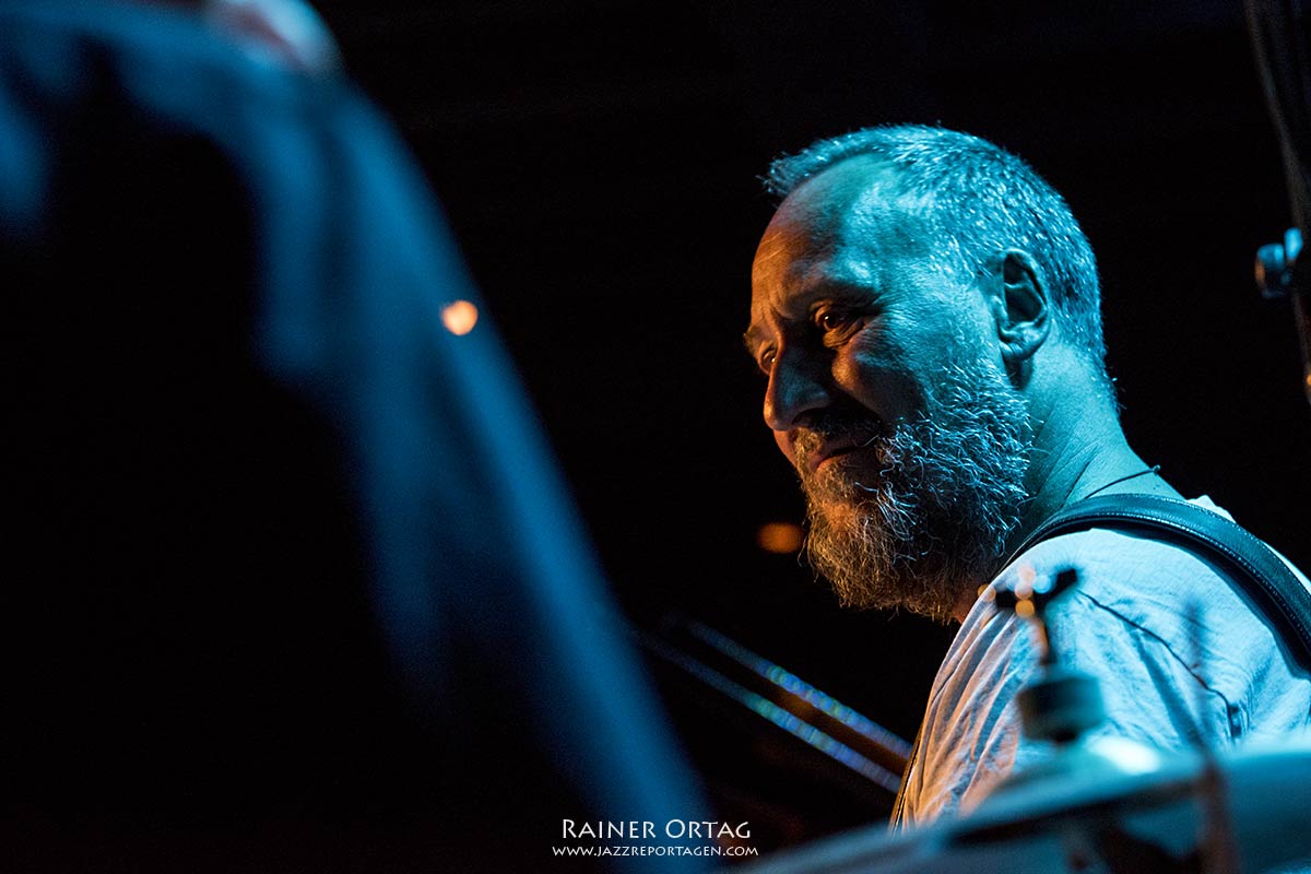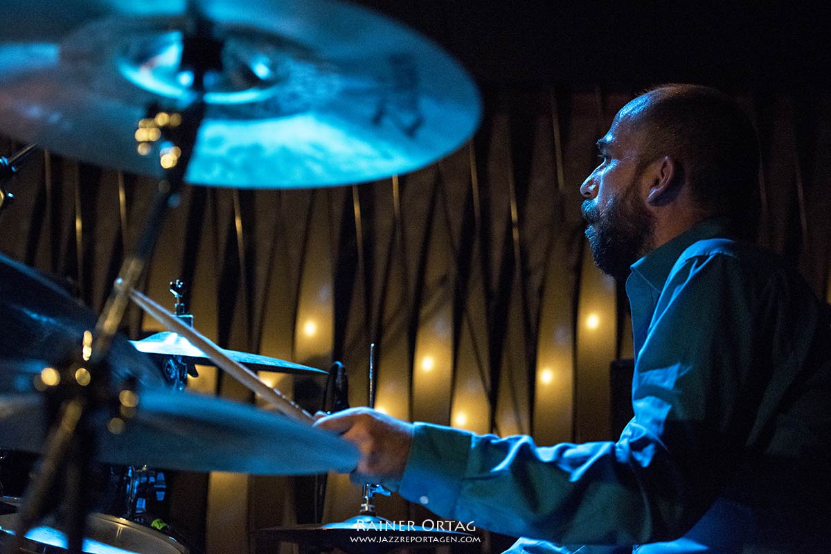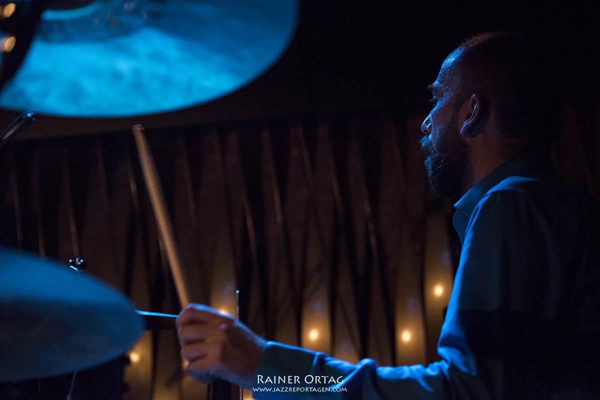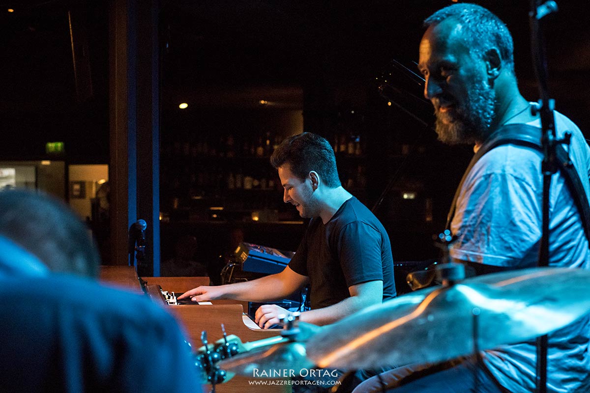 Nun hat er eine Band gefunden, die in der Lage ist, seine Vorstellungen eins zu eins umzusetzen. An diesem Abend präsentierte sich das Trio aus einem Guss und der sympathische Tastenmann schickte nach bemerkenswerten Breaks und Soli immer wieder ein strahlendes Lächeln zu seinen Mitstreitern, die genau wie er, mit überquellender Spielfreude ans Werk gingen. Die Bandbreite der Kompositionen reichte von Gänsehaut-Balladen mit warm perlenden Klangkaskaden bis hin zu treibenden Beats, bei denen vor allem Drummer Smock eine kräftige Duftmarke setzte. Dafür gab es immer wieder frenetischen Szenenapplaus. Die letzte Nummer des ersten Sets „Summer in Berlin“, nahm solche eine Fahrt auf, dass eine (Verschnauf-)Pause auch dringend notwendig war. Funky ging es danach gleich weiter. „One for G.D.“ war George Duke gewidmet, den Oslender als eines seiner Vorbilder bezeichnet. Im Intro wunderbar lyrische Basslinien, die ganz langsam zu einer groovenden Klangdichte führten, die mit super getimten Breaks Smock viel Raum boten, seine ganze Klasse herauszutrommeln.
