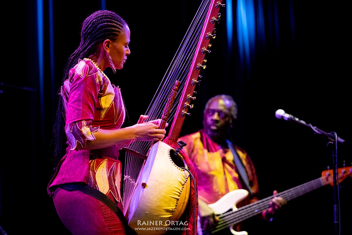 Dass dies nur bedingt gelingen kann liegt dabei nicht an ihr, sondern eher an den Umständen, auf die sie bei ihren Konzerten trifft: starre Sitzreihen mit ansteigendem Gestühl und grell erleuchtete Bühne mit dunklem Zuschauerraum mögen den Besuchern die bestmögliche Sicht auf das Bühnengeschehen ermöglichen, Interaktion, Tanz und Feststimmung kommen dabei leider nicht auf. Um so erstaunlicher war, dass dieser Abend trotz aller Einschränkungen ein sehr intensives Musikerlebnis vermittelte. Schlagzeug und Percussion im Doppelpack sind der Garant für Afrikanischen Groove, Bassgitarre und Flamencogitarre sind der ideale Begleiter für die unbestrittene Attraktion des Konzertes: die stehend gespielte Stegharfe, die Kora.