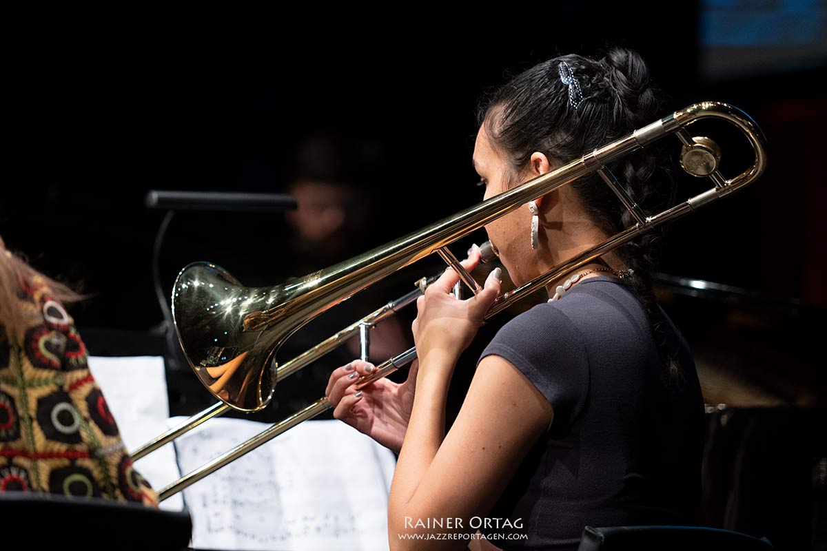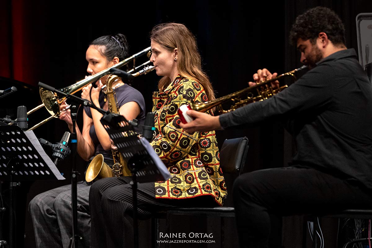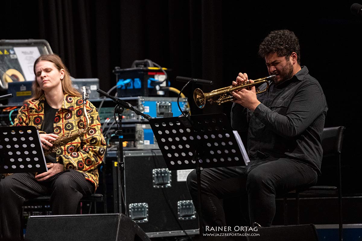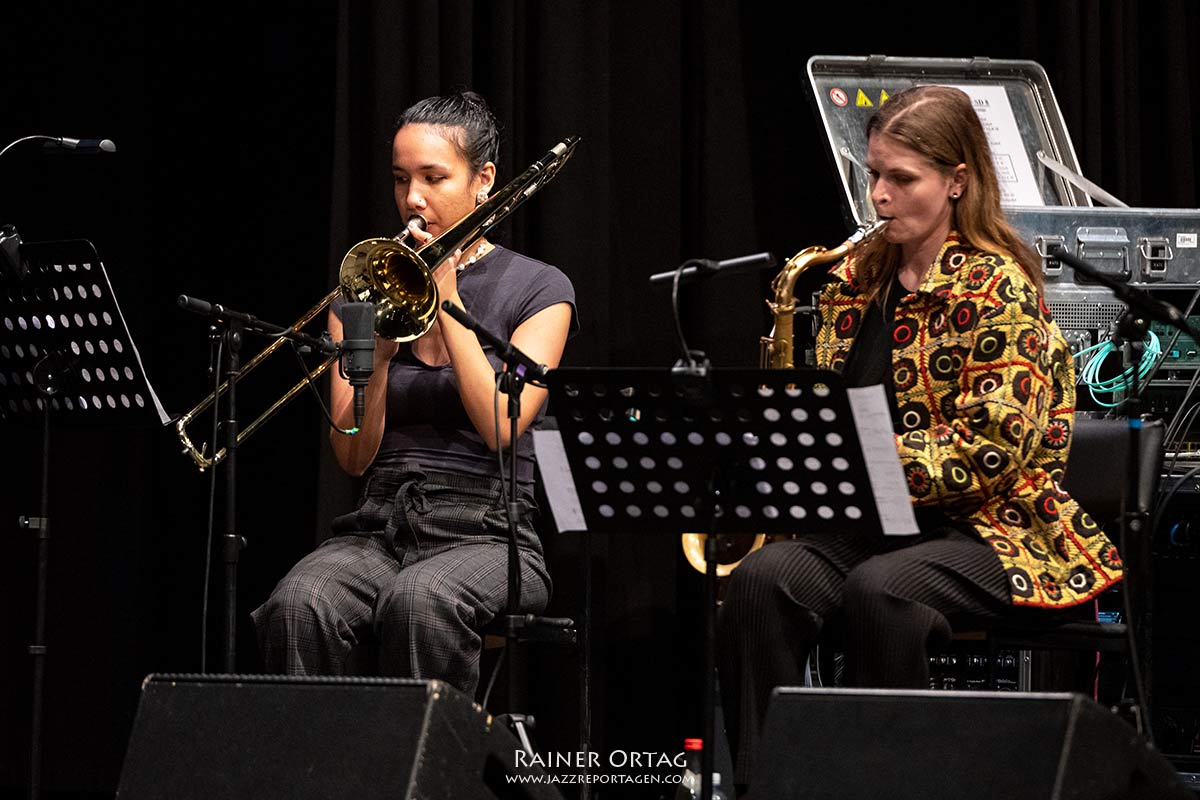Und dann, tatsächlich, fast wie aus verhangenem Himmel, Swing, Groove, überraschender Übergang in eine fast unbeschwerte Schluss Sequenz. Wunderbares Zusammenspiel zum Beispiel von Nicole Glover am Tenorsaxofon und Kalia Vandever an der Posaune. Fast wie wenn sie uns mit einem Augenzwinkern sagen wollten `keine Sorge, wir kennen das Jazz – Alphabet`, und uns ein bisschen versöhnen wollten, mit der Schwere der Welt. Und immerhin könnten wir uns ja bei unserem nächsten Gang durch den Wald mal auf unsere Ohren konzentrieren, und so ganz seltsame einzelne Geräusche wahrnehmen, die entfernt an eine Trompete erinnern…
