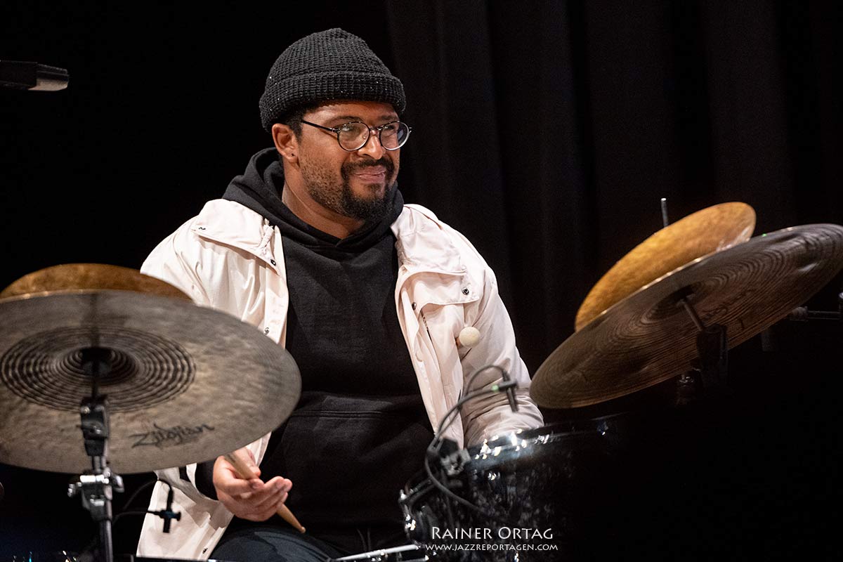 Und es gab einen zwar streckenweise in sich gekehrten Kayvon Gordon am Schlagzeug, dessen Spiel auf den Becken so behutsam, vielfältig, flächig, fein und schwebend sein konnte, wie lauer Wind in einem Herbstwald. Es gab – ein weiterer Höhepunkt – eine minutenlange Bass – Drone – Fläche, die pur Energie verströmte.