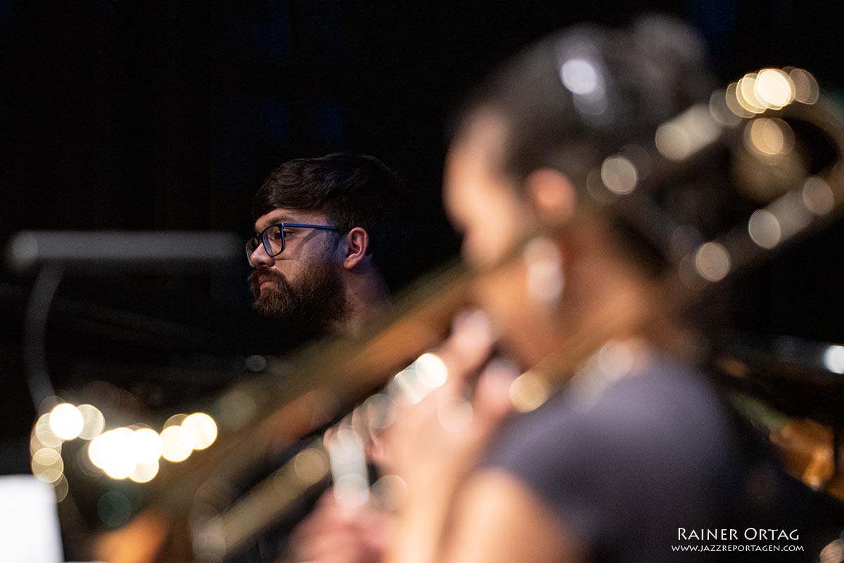 `Forest` hat Micah Thomas sein Projekt, seine Band, genannt, und nach dem Bass – Trompeten – Auftakt setzte sich so eine Art Suchen und Finden fort, weitete sich nach und nach aus, auf das gesamte Ensemble, allerdings ohne sich in (ein)-gängige metrische Strukturen zu begeben. Erstes Highlight dann: eine ins Rund geblasene Stakkato – Passage, die aufgegriffen, weitergegeben, beschleunigt, verfremdet wurde, zurückkam, mehrmals, noch schneller wurde, vielleicht auch anders (Stille Post heißt das `Kinderspiel`) um dann in einem recht furiosen Klanggebilde – vorläufig – zu enden. Whow. Pause. Stille.