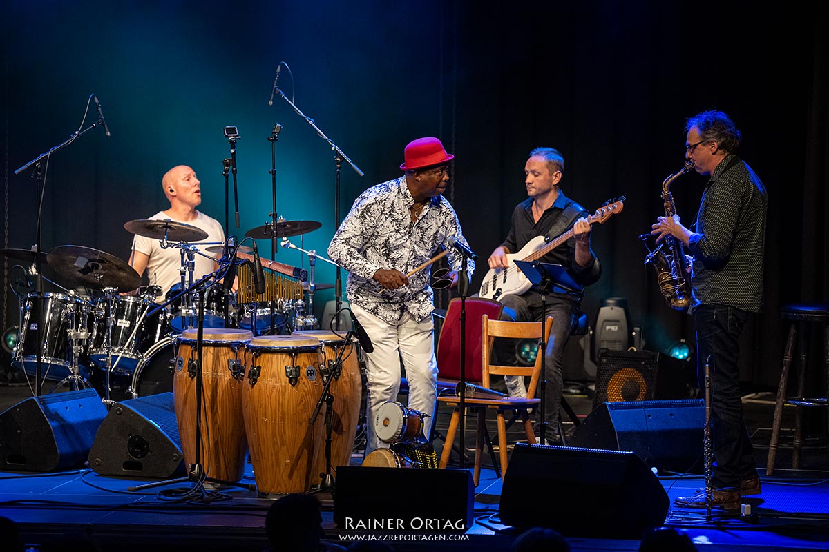Roberto Santamaria, in Havanna geboren, lebt seit vielen Jahren in Tübingen. Somit kann man den Neffen des berühmten Perkussionisten Mongo Santamaria getrost als Lokalmatador bezeichnen. Hier fand er auch die kongenialen Musiker, mit denen er das spielen kann, was der Kubaner bereits mit seiner Muttermilch aufgesogen hat und wofür sein Onkel stand: Jazz made in Cuba! Gewiss, die Fußstapfen seines Onkels sind groß, landete dieser doch mit Afro Blue bereits Ende der 50er Jahre einen Jazz-Welthit, der auch zu John Coltranes Repertoire gehörte. Doch wenn man, wie Roberto, in Habana Vieja aufgewachsen ist, sind das schon mal gute Voraussetzungen, sich den Groove einzuverleiben, der durch alle Winkel dieses Altstadtviertels weht. Schon als kleines Kind trommelte er auf allem was Töne von sich gibt. „In dieser Umgebung kannst du der Musik nicht entfliehen“, sagt der „reingeschmeckte“ Tübinger.