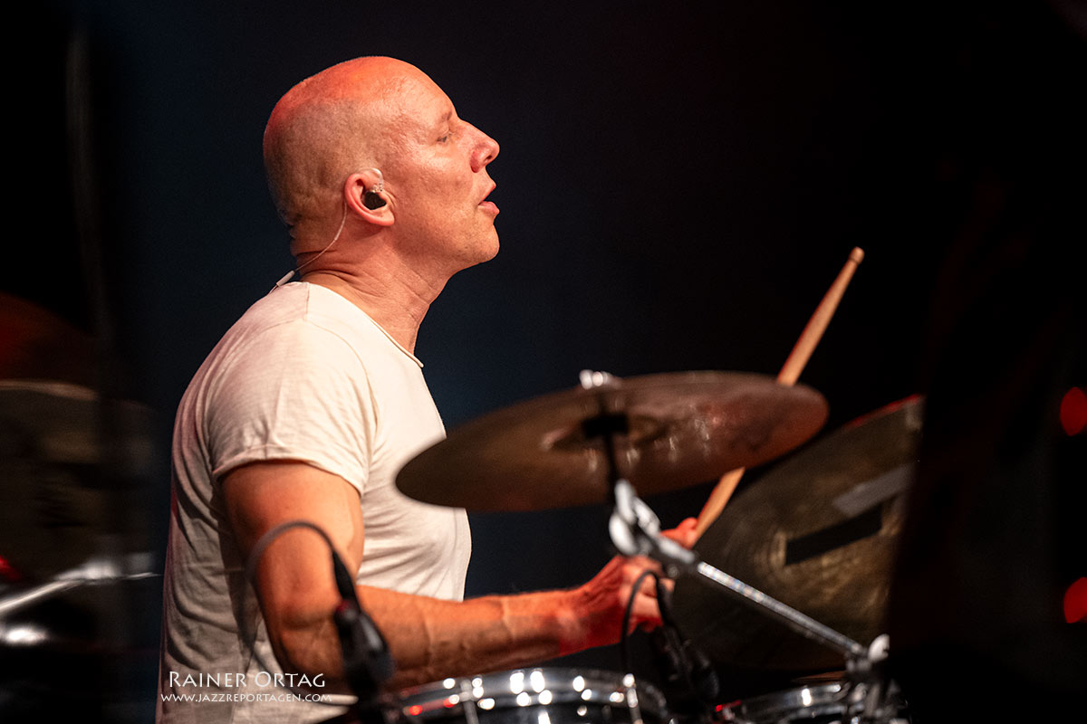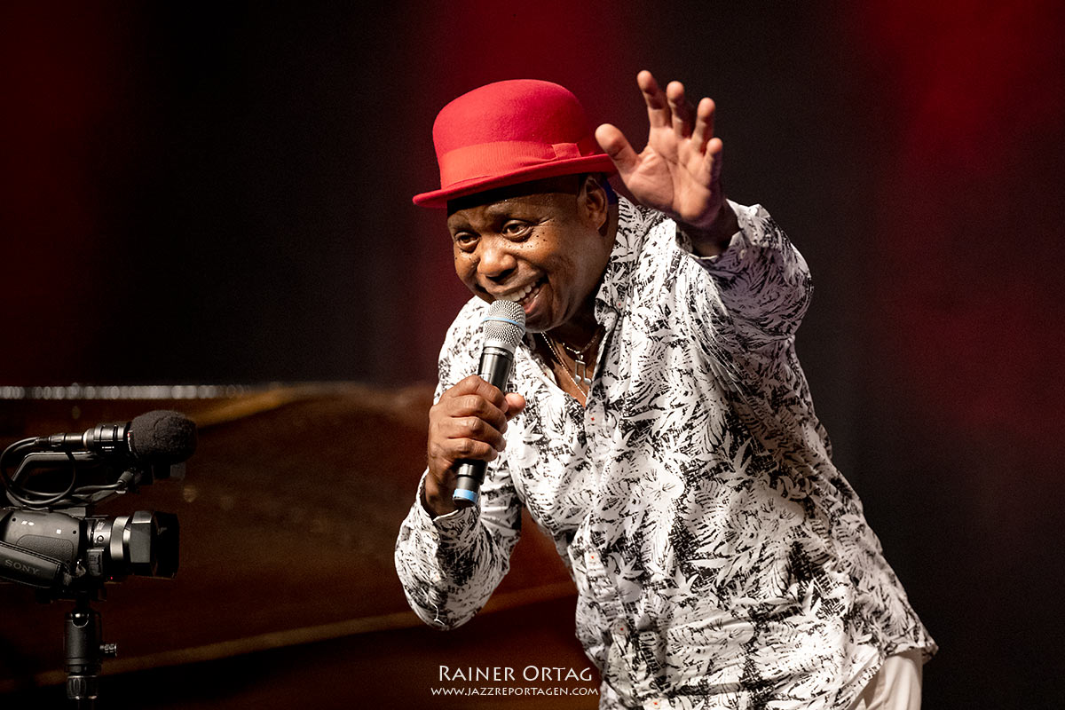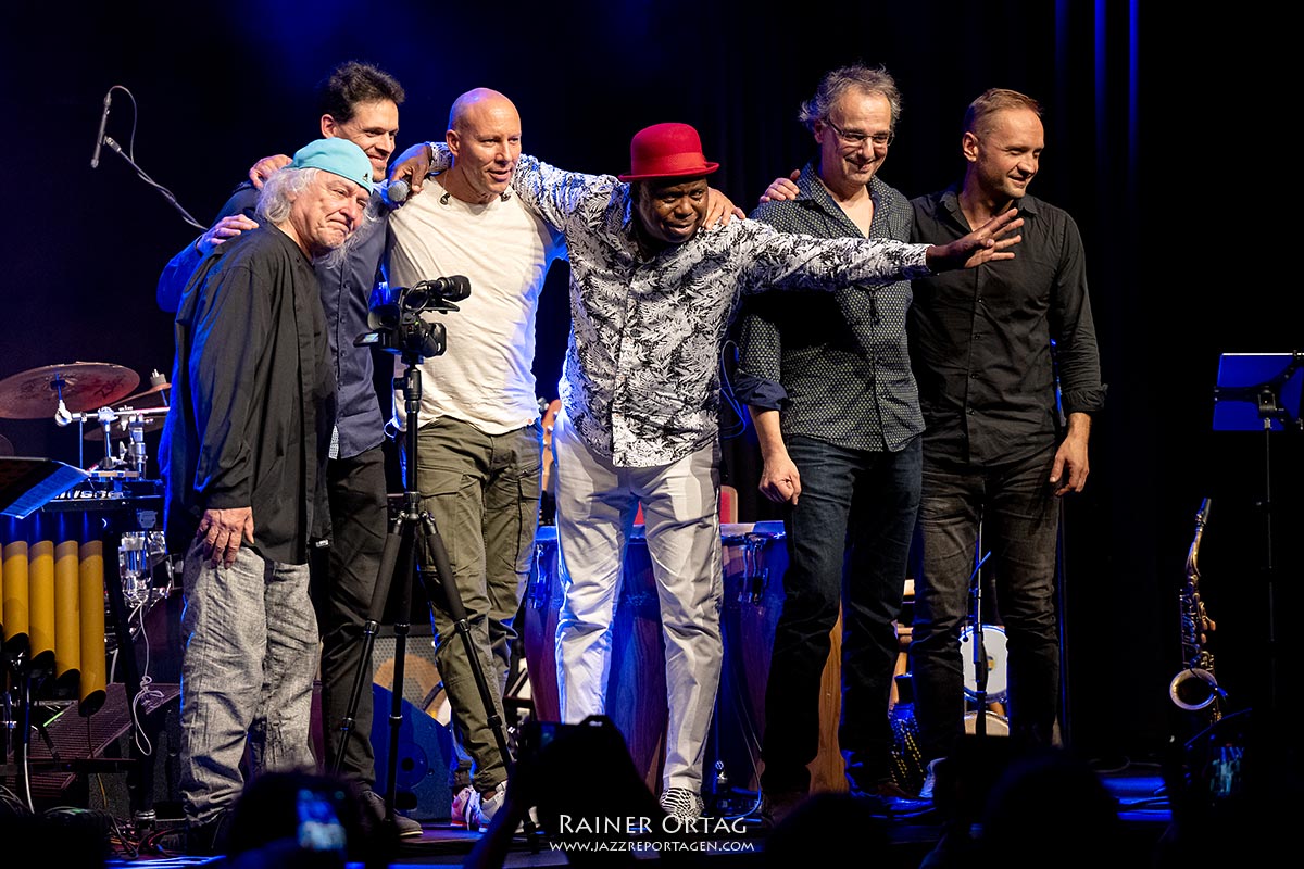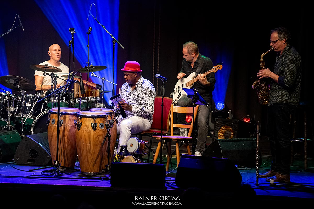 Nach Mambo Mongo begibt sich die Formation in ganz andere musikalische Gefilde: „Vielleicht komme Weinen in deine Augen“, sagt Santamaria, als er Imagine von John Lennon ankündigt und weist auf die Kriegswirren in der Welt hin. Ein flächig harmonisches Vibraphon Intro eröffnet die Ballade, die tatsächlich das Zeug hat, bei aller Lebensfreude, das Leid dieser Welt nicht zu vergessen. Bevor es in die Pause geht, kommt Madiba mit knackigen Unisono-Licks und einer virtuos gespielten Shékere daher, eines der Percussion Instrumente, das Santamarias Rhythmus-Kunst genauso offenbart, wie er es am Conga Set, an den Bongos oder auch an den Bells unter Beweis stellt. Auch Besucher Joachim Staudt, der ebenfalls zu den Granden der Tübinger Jazzszene zählt, freut sich im Pausengespräch mit unserem Magazin an der knisternden Energie, die diese Combo versprüht.