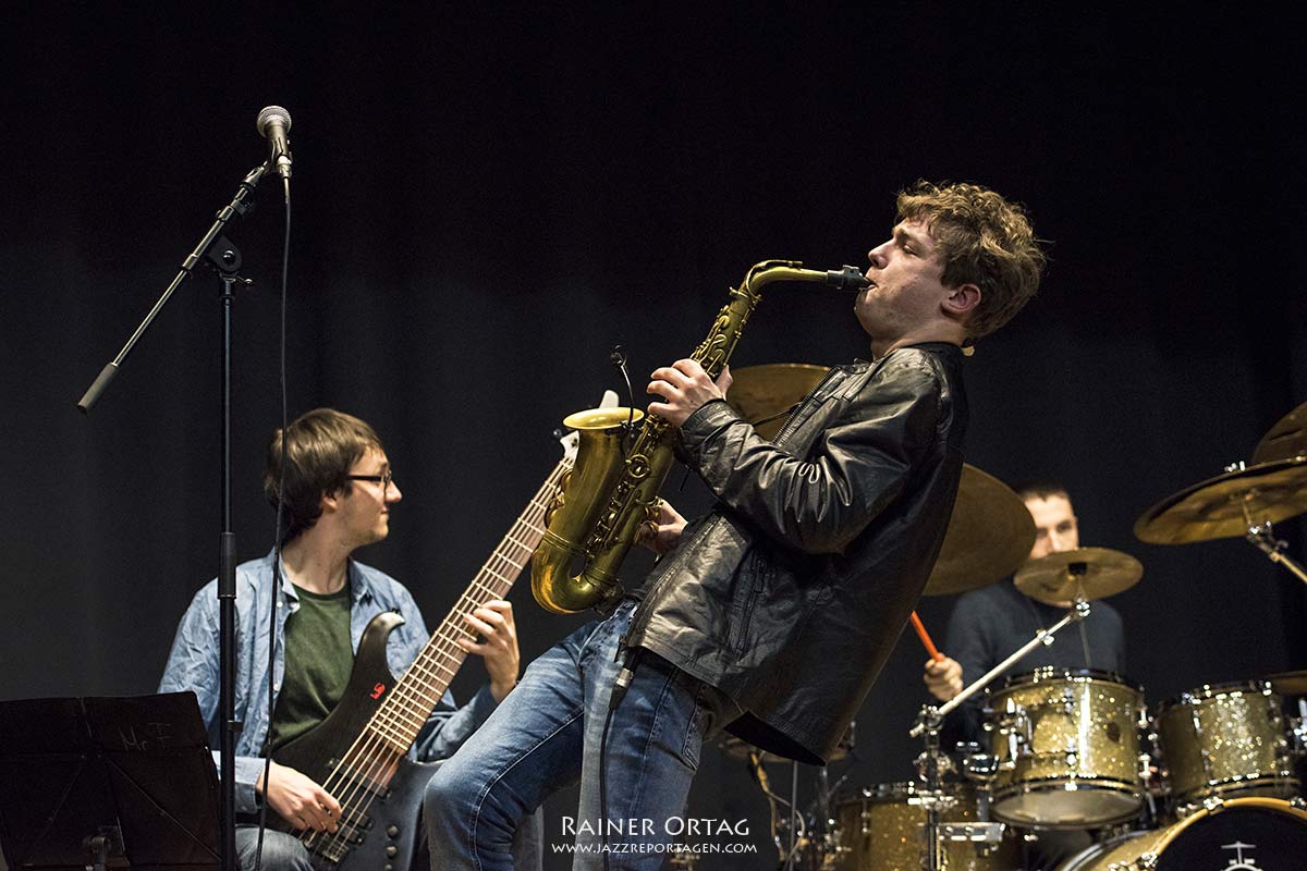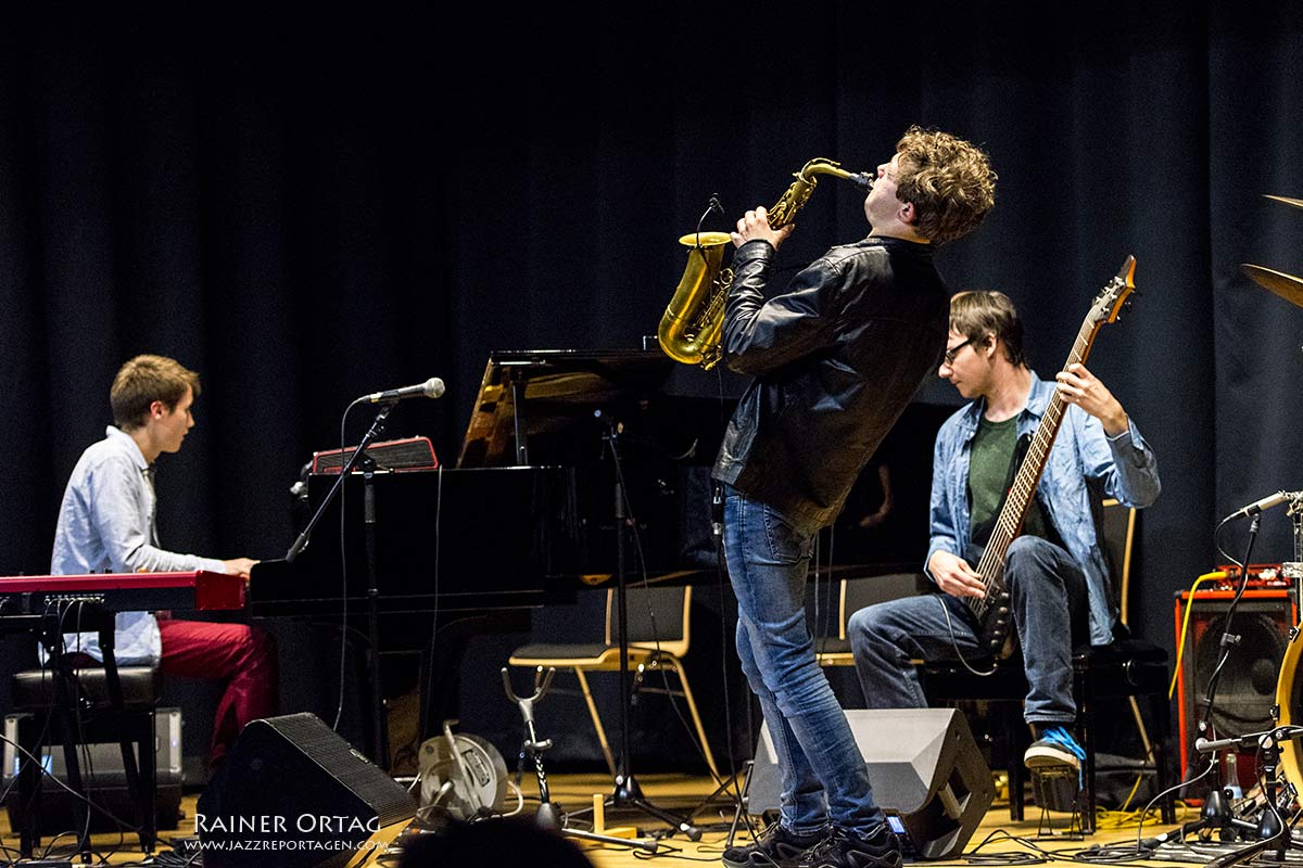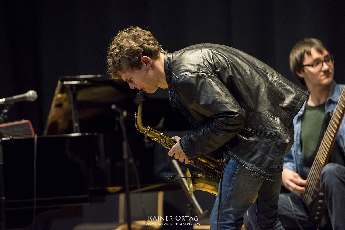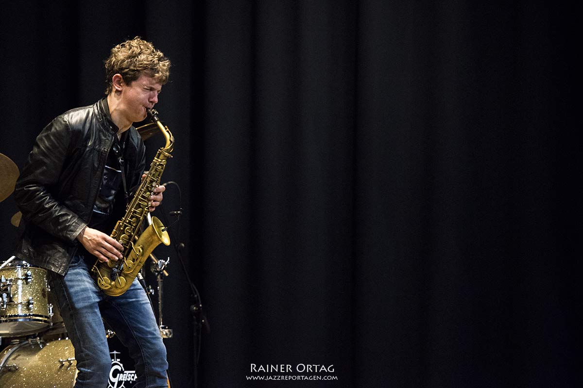 Jakob Manz, geboren 2001, hat bereits 10 Jahre Schlagzeug-, 8 Jahre Blockflöten- und 6 Jahre Saxophon-Unterricht hinter sich. Seit 5 Jahren studiert er Saxophon! Es ist wirklich unglaublich! Natürlich hat er schon diverse Preise gewonnen und seit 3 Jahren tritt er immer wieder mit seinem The Jakob Manz Project auf. Er beherrscht versiert alle Nuancen des Jazzsaxophons. Von gefühlvollen Balladen bis zu funkigen Soli überzeugt er das begeisterte Publikum.