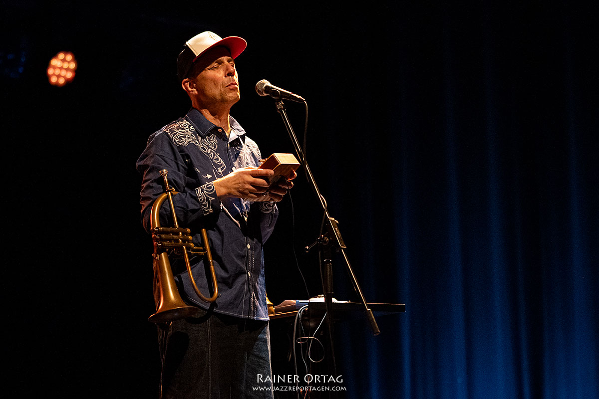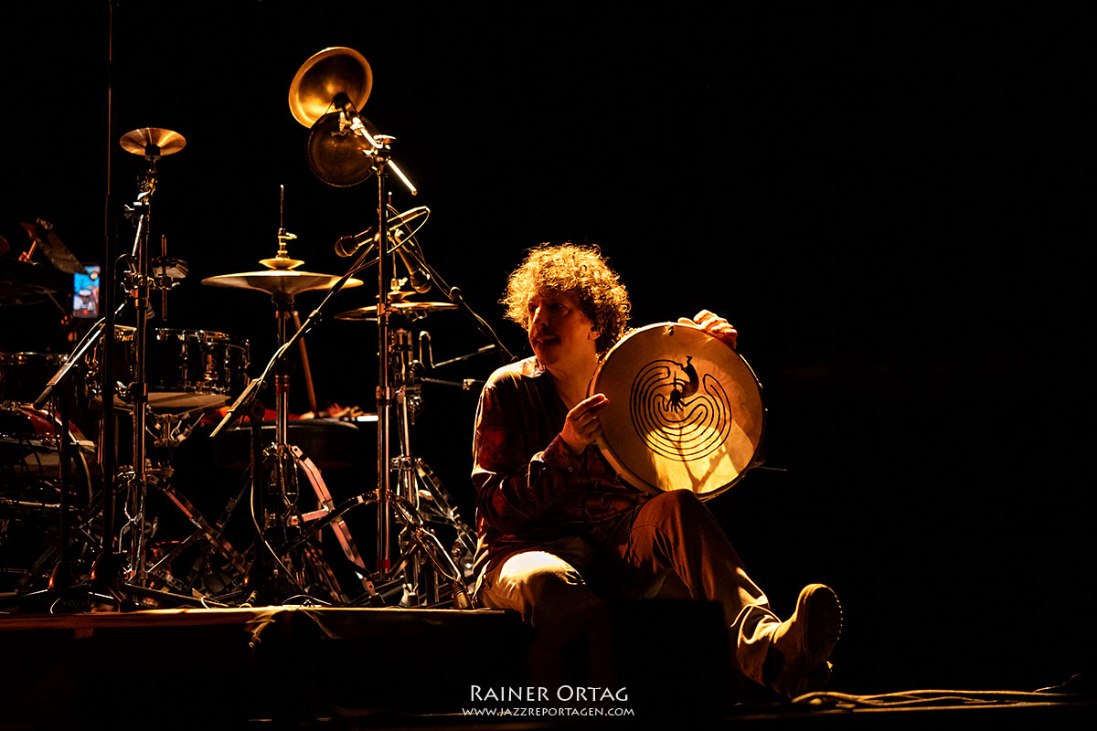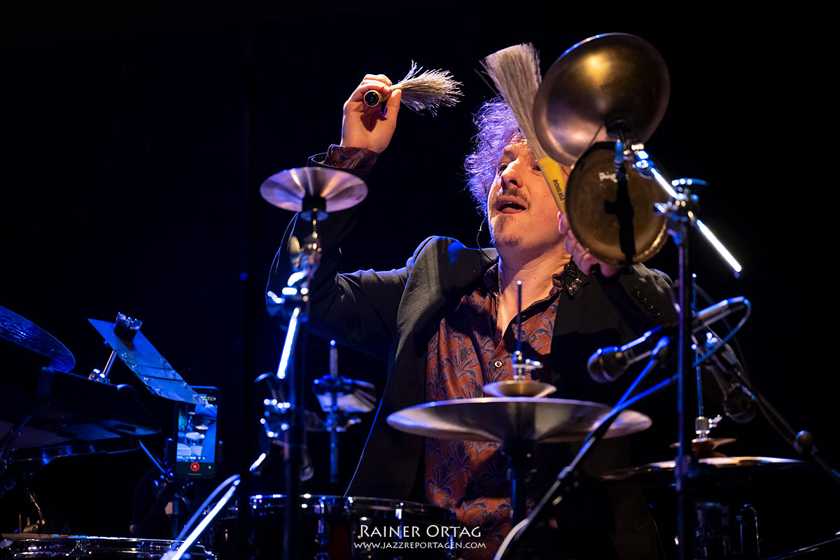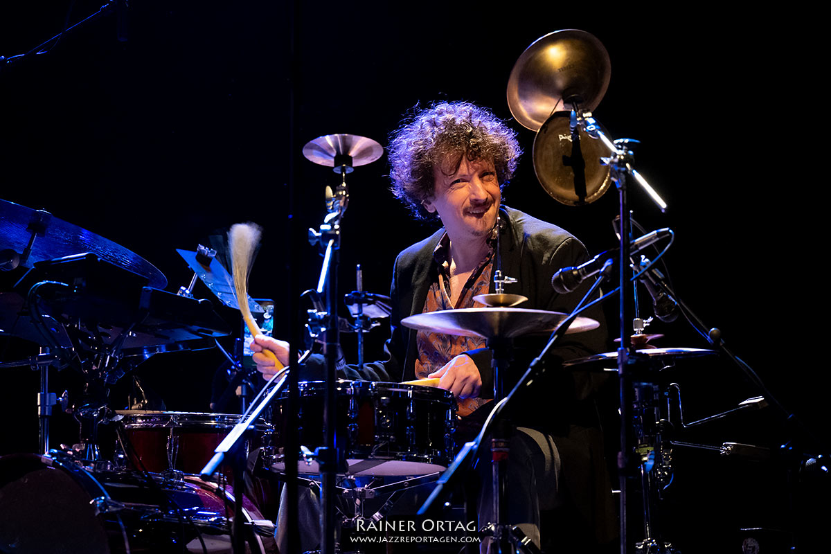 Doch stets ist Rhythmik im Spiel perfekt inszeniert von Diego Pineira, der bei seinem kurzen Solo eine unwahrscheinliche Kreativität an den Tag legt. Mal kraftvoll barbarisch seine Drums bearbeitet, um Sekunden später wieder liebevoll schlagend weiter zu spielen. Nach dem Teufelsdrummer Niggli, wie Vocalist Schaerer seinen Mitspieler vor einer Stunde nannte, ist Pineira, nach Curt Cress, Wolfi Schmidt, Triluk Gurtu und Wolfgang Haffner ein weiteres drumtechnisches Highlight bei den Jazztagen im Theaterhaus.