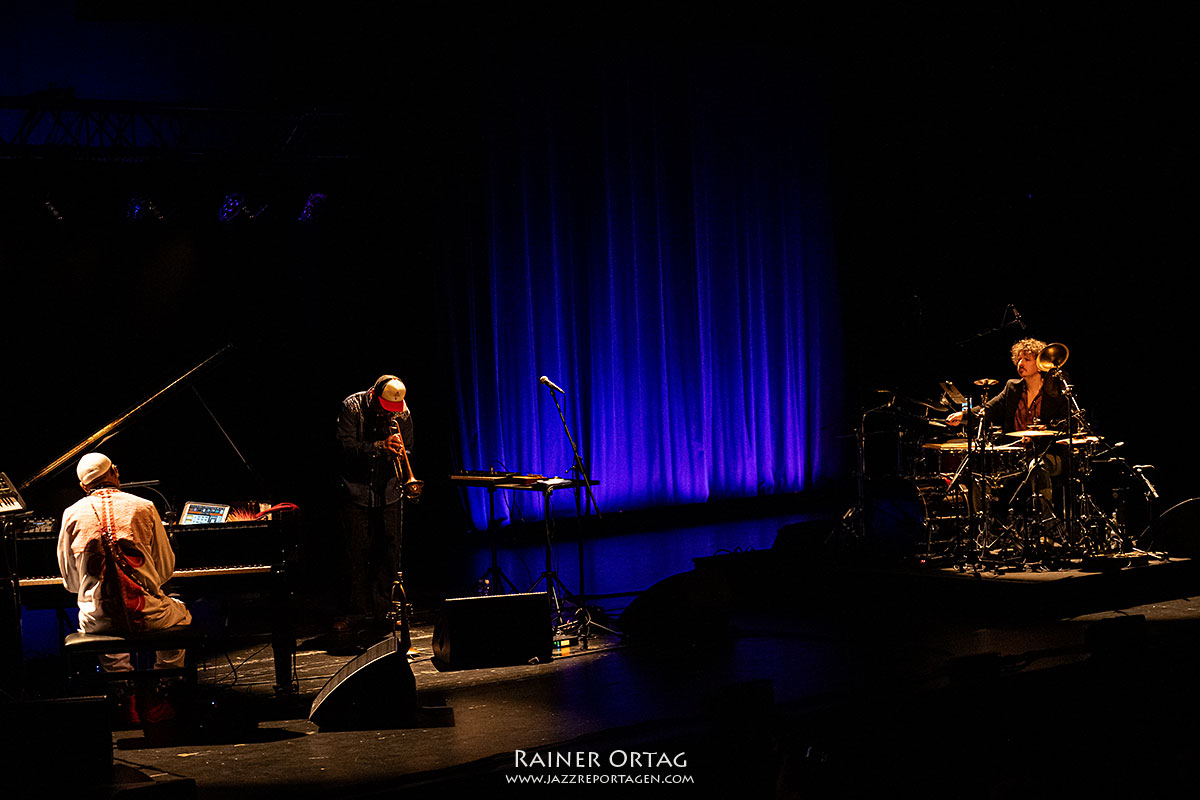 Nach dem sich der „musikalische Overload“ bei einem Gläschen Wein, einem Bier oder einem anderen Kaltgetränk in den Hirn- und Gehörwindungen verflüchtigt hatte und man den Resetknopf drückte, konnte man sich relativ unbedarft zurück in den Konzertsaal begeben um sich auf einen weiteren musikalischen Trip einzulassen. Der kubanische Pianist Omar Sosa, der Trompeter Joo Kraus und der südamerikanische Drummer Diego Pinera betreten die Bühne um die Zuschauer auf diese facettenreiche musikalische Reise mitzunehmen. Schon alleine als der nahezu immer lächelnde Sosa über die Bühne zu seinem Klavier schreitet ist schon der Bann gebrochen und gute Laune flutet den Saal. Wie immer in einem extravaganten Outfit ist Sosa auch optisch eine besondere Erscheinung. Dagegen wirkt Trompeter Kraus eher introvertiert und zurückhaltend. Sosa übernimmt sofort das Kommando Kraus und Pineira halten sich dezent zurück und untermalen das Klavierspiel mit sanften Tönen und Beats.